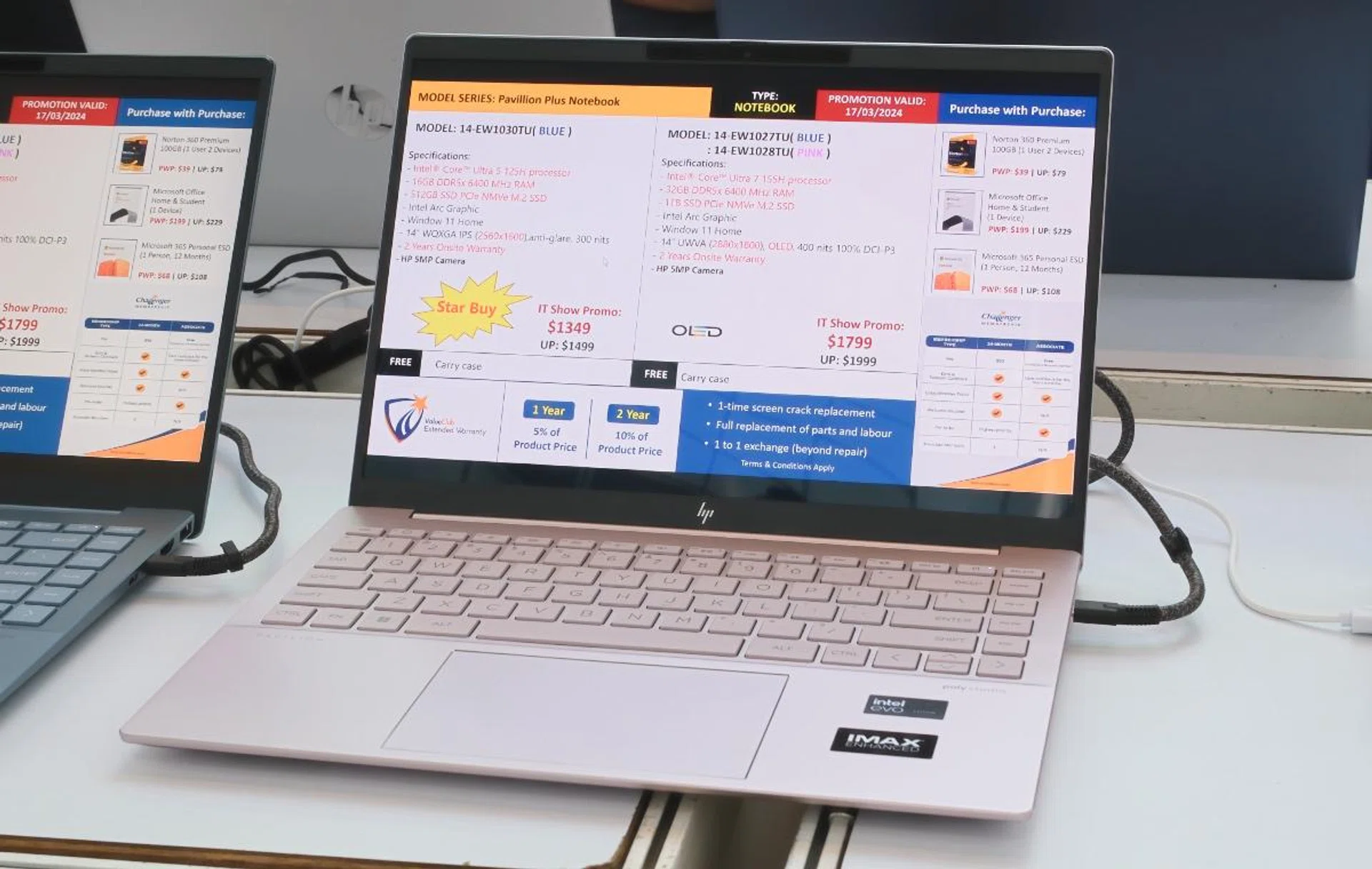 There aren't many notebooks with Intel's newest Meteor Lake processors at the show. However, here's one that I found. It's the HP Pavilion Plus, which has a 14-inch display with a resolution of 2560 x 1600 pixels, and is powered by the new Intel Core Ultra 5 125H processor with 16GB of memory and a 512GB SSD. It also comes with two years of on-site warranty. It's going for S$1,349 (U.P. S$1,499).