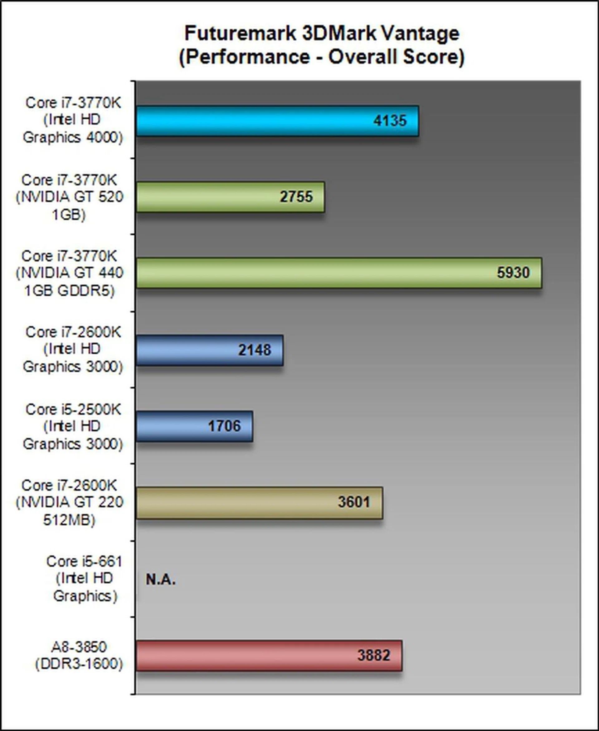 The Intel HD Graphics 4000 even bested AMD's Fusion concept based AMD A8-3850's results but that's only because 3DMark Vantage also factors in the CPU's capabilities in computing the overall score. Given that the Intel Core i7-3770K has much better general compute performance, 3D Mark Vantage score for the Intel camp came a little ahead of the AMD processor.