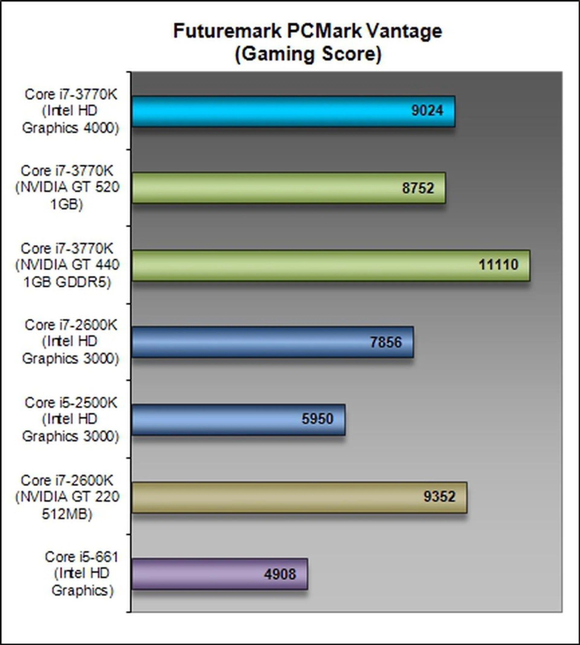 For the Gaming suite of the PCMark Vantage benchmark, Intel HD 4000's scores were stellar and pulled ahead of the NVIDIA GeForce GT 520 by a marginal amount. Against the older DX10 GeForce GT 220, it was just a hair behind it with a 4% differential. With the more powerful GeForce GT 440, it beat the Intel HD 4000 by a margin of about 23%. Compared to the Intel HD Graphics 3000, the new Intel HD Graphics 4000 pulled ahead by margins in the range of roughly 15%. Take note that PCMark's gaming score doesn't really tax the graphics engine much and is still primarily a CPU dominant benchmark. The other graphics tests should prove to be more accurate of the GPU's capabilities.