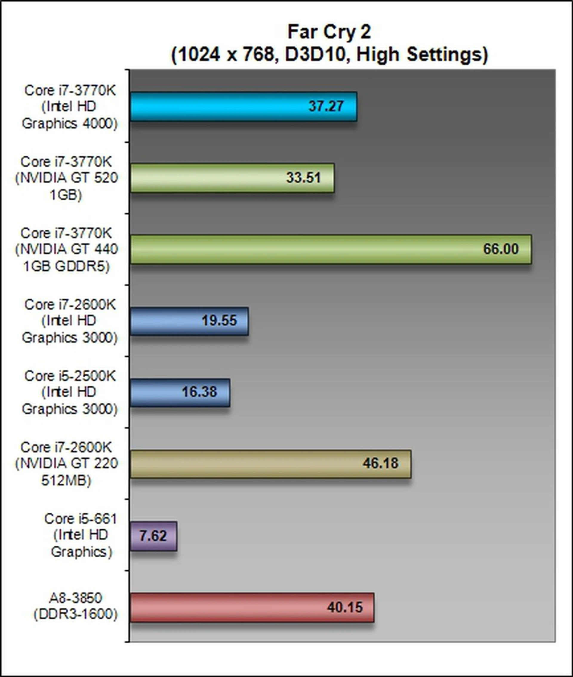 Having seen the theoretical graphics performance numbers in 3DMark Vantage, it's time to follow-up with a DX10 gaming title with Far Cry 2 to find out how it really translates in an actual game. In this benchmarking test, the frame rates churned out by the on-die Intel HD Graphics 4000 was fairly impressive as it finally broke past the absolute minimum average of 30fps and delivered average frame rate of 37.27! This came up to be 11% better than the discrete GeForce GT 520 graphics card and up 91% improvement over the last generation Intel HD Graphics 3000!