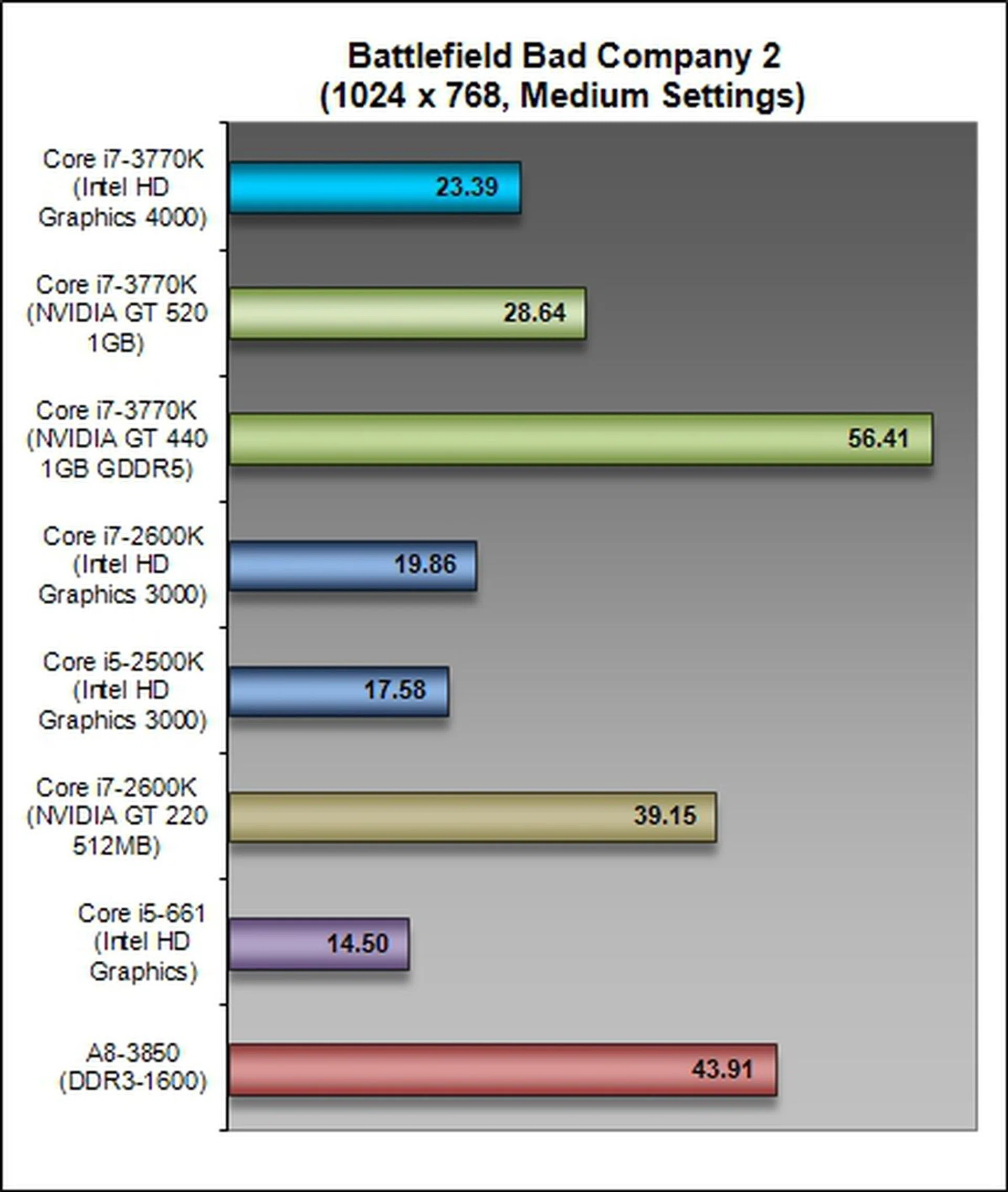 So DirectX 10 performance is looking decent for Intel's third-generation HD Graphics engine. What about DirectX 11? With the failure of Intel's new HD Graphics 4000 to run 3DMark 11, we jumped directly to a game supporting it - Battlefield Bad Company 2. Take note that in this game, the results should be taken in with care - there's a mix of DX10 and DX11 capable GPUs for which the latter will run the game utilizing DX11 routines. As such, the scores aren't exactly comparable.