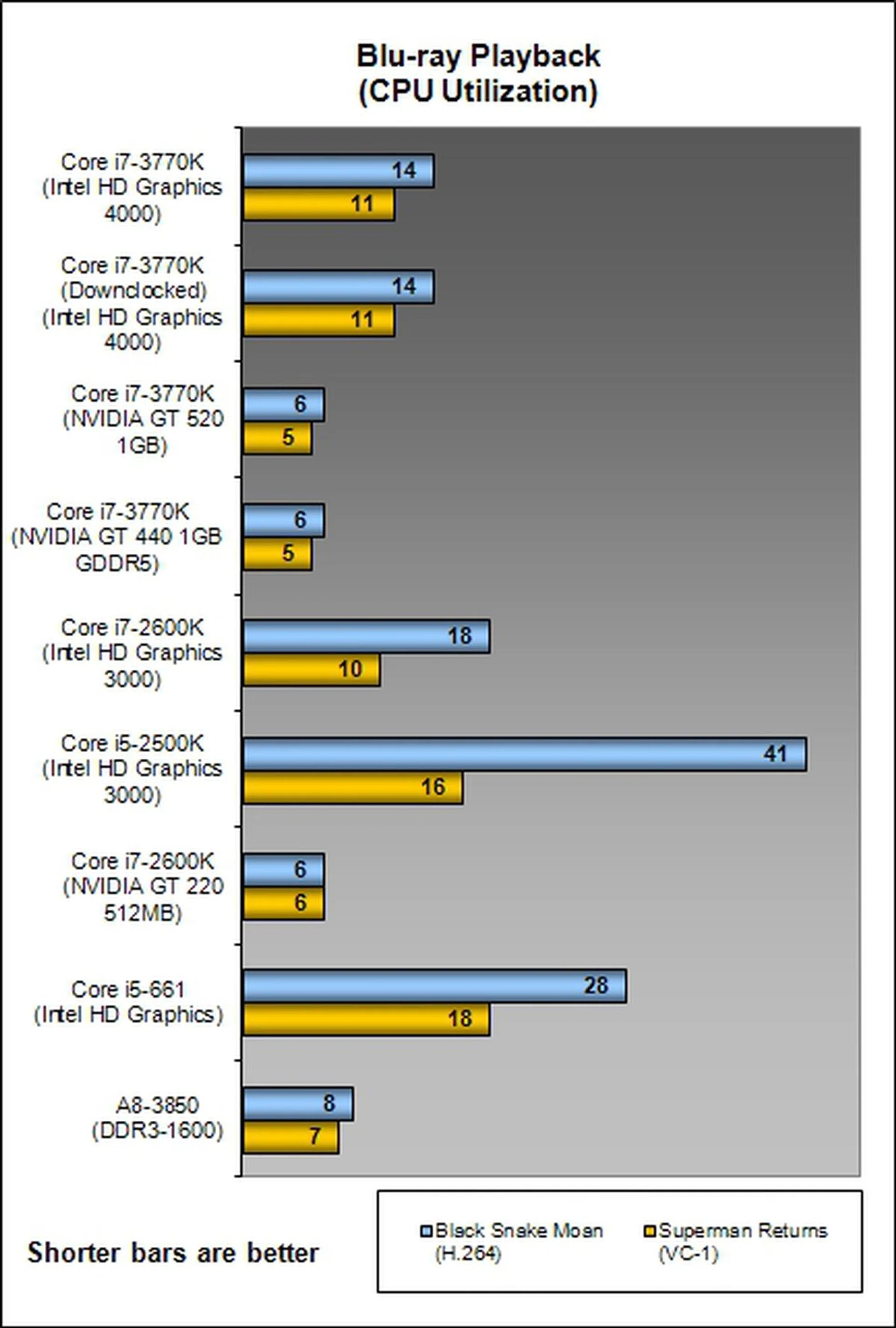 In terms of CPU utilization for our Blu-ray playback, the Intel HD Graphics 4000 saw its performance slightly improve over the Intel HD Graphics 3000. It improved most (about 25% better) when handling our more complex and higher bitrate H.264 encoded movie title. While it couldn't best the discrete graphics solutions, at these levels of utilization, there's not much to be concerned about in normal usage. AMD's A8-3850's integrated GPU did manage much better CPU utilization rates (up to 75% better than Intel) that can very well be classified as true discrete level of video decoding performance.