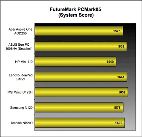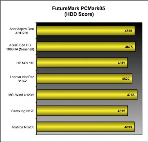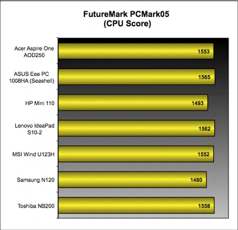 With our review netbooks basically using the same Intel Atom processor and 5400RPM HDDs (though not of the same make), we expect to see no difference in our PCMark05 benchmark, and after running all seven netbooks through the benchmark, our expectations were proven true. As can be seen from our table earlier, the results indicate only slight fluctuations in the scores which mean there's really not much of a performance difference between the netbooks.