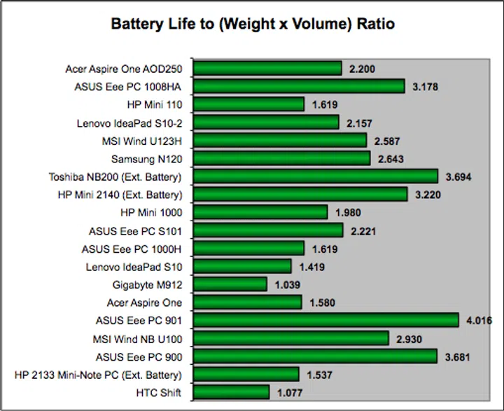 This is where it gets interesting, after all, manufacturers have had time to play around with the form factor, design and build of the netbooks, and depending on the battery life and dimensions of the netbook, our Portability Index benchmark will come up with a figure that indicates how portable a notebook can be. A higher number is eminently desirable, as it shows how much more portable the machine is compared to the others.