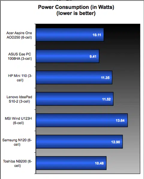 Power consumption figures are generally the same all around, with slight variances expected due to minor differences in hardware set up. The Intel Atom processor generally performs at this level based on our previous experiences, so don't expect to see game changing results until the next generation of Atom processors are finally launched by Intel.