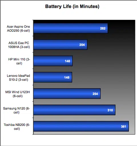 If you're going to be carrying around a netbook, the last thing you'll want is for a netbook to prematurely die on you while you were surfing the internet on the go, so battery life for netbooks is probably one of the more important things to consider when getting a notebook. Again, not all notebooks come with similar sized battery so you'll definitely see differences in battery life. We've tried to ensure that these units come with the default battery configuration, and have mostly succeeded on that account. Only the Toshiba NB200 came with an optional 6-cell battery and not the 3-cell of the default, but you can roughly estimate its battery life to be about slightly half that of the 6-cell performance.