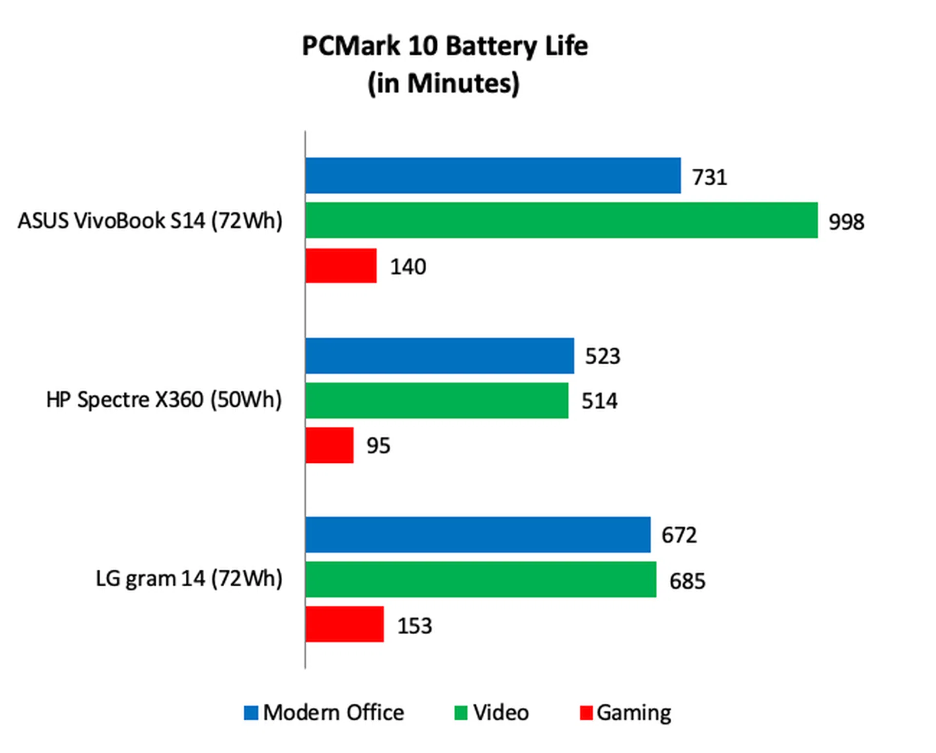 The gram 14 performed well too. Though it didn't last as long as the VivoBook S14, it managed over 11 hours on both the Modern Office and Video workloads. And on the Gaming workload, it lasted the longest at just over two and a half hours.