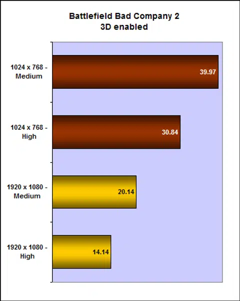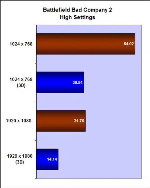 Next, let’s take it look at its 3D performance on Battlefield Bad Company 2. As the graph shows, enabling 3D had an adverse effect on frame rates, which we had expected. As we’ve mentioned, with 3D enabled, the ASUS G73Jw now needed to render two frames at any given instance to create an illusion of depth. This meant that its workload has doubled, which also explains why with 3D enabled the ASUS G73Jw was only half as quick.