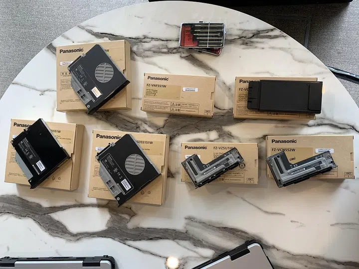 Here you can see where some of the modules fit into the Toughbook 55 to expand and update its capabilities of the model you're currently operating. Standard Interfaces include two USB3.1 ports, one USB 3.1 Type-C PD port, one HDMI port, one LAN port, one micro SDXC slot and an optional Dual-Path Through.