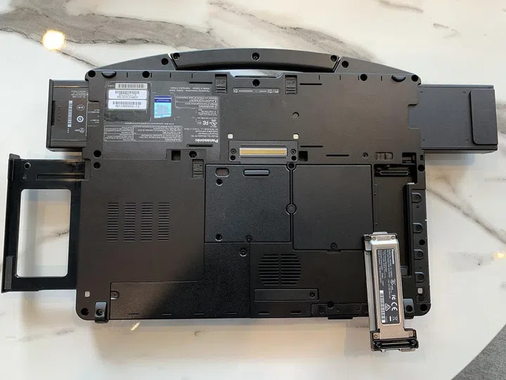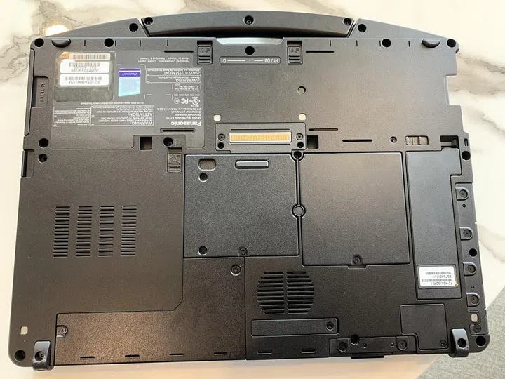 Viewed from the bottom, you can see the carrying handle at the top, and some of the push-clips used to remove or add modules. The Toughbook 55 comes with an 8th generation Intel Core i5 vPro Quad-Core CPU, RAM options ranging from 8GB to 64GB, and a 256GB / 512GB / 1TB SSD or a 256GB / 512GB / 1TB OPAL SSD that is designed with security in mind and makes data retrieval difficult if it comes under the possession of unauthorized users.