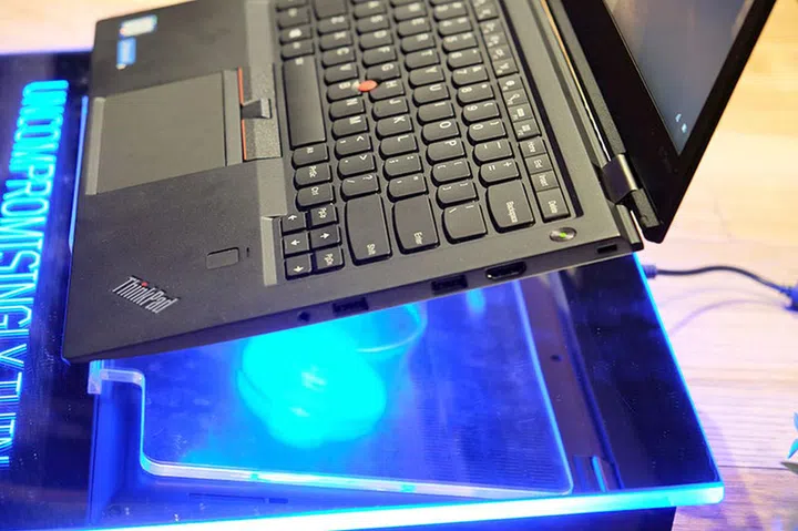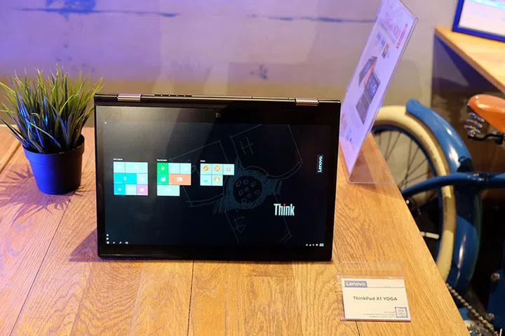 The ThinkPad X1 Yoga can be used in four different modes – laptop, stand, tablet, and tent. Here's a look at it in tent mode.