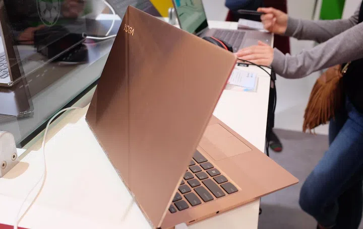 The ultra-thin Yoga 920 convertible is offered in three colors: Bronze, Copper (pictured here), and Platinum. On the left are two Thunderbolt 3 USB Type-C ports and a 3.5mm audio jack.