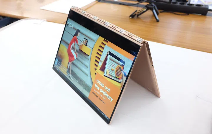 As expected, the Yoga 920 can be transformed into one of four modes – laptop, stand, tablet, and tent (pictured here) – thanks to the 360-degree watchband hinge. It also addressed the Yoga 910's awkward camera position by placing its 720p HD camera on top of the display, which you can configure with either a Full HD and Ultra HD IPS touchscreen panel. Lenovo also shaved the vertical bezels down to 5mm, resulting in a near bezel-less viewing experience.