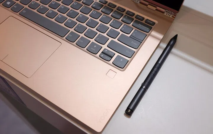 Polished CNC aluminum figures prominently in the construction of the Yoga 920, which not only adds resilience against wear and tear, but also exudes elegance. Underneath the right directional key is the fingerprint reader that allows for fast and secure login via Windows Hello. Next to the Yoga 920 is the Lenovo Active Pen 2, an optional digital pen with pin-point accuracy, palm-rejection technology, and 4,096 levels of pressure sensitivity.