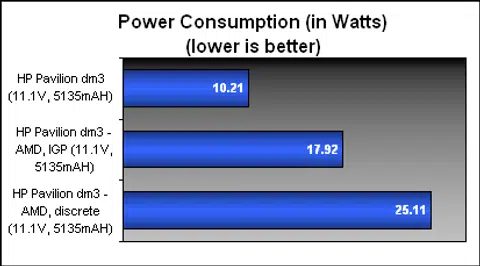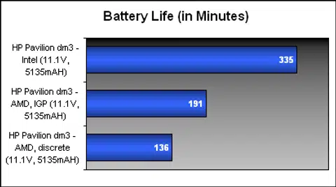 Moving on to the power efficiency of the notebooks, the thermal design power (TDP) of the respective platforms would be a good indicator for starters. While we don't know the entire platform's TDP, we do know that the Intel Core 2 Duo SU7300 processor's TDP rating is just 10W, while the AMD Turion Neo X2 L625 requires much more juice at 18W. This discrepancy is mostly in due to the 45nm and 65nm engineering process used to manufacture the Intel and AMD mobile processors respectively. This does mean on paper alone, the AMD solution would be faced with higher power consumption and thus a lower battery life. This is because both platforms are using the same HP Pavilion dm3 design components of which the 6-cell battery pack is identically rated for 57Wh capacity. But how much of a discrepancy in operating time are we talking about?
