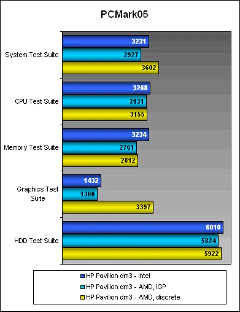 Though this benchamark is getting dated, it's still a very functional benchmark that revealed interesting results. With the discrete graphics enabled, the AMD platform based HP Pavilion dm3 scored higher than the Intel unit in the overall System Test suite. Even with just the IGP engine working, the AMD platform held up well, scoring just slightly behind the Intel platform. Specifically focussing on the CPU scores, while both platforms returned close results, the processor still leads AMD despite a slower clockspeed; this is quite likely due to the large difference in cache size that affects simple productivity related tasks which this benchmark concentrates.