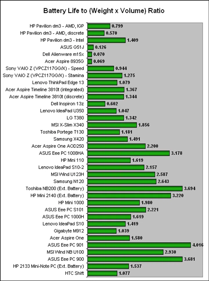As for the ratio obtained by the Intel platform based HP Pavilion dm3 compared with others of its class, it was actually among the highest like the Acer Aspire Timeline 3810T, LG T380 and few others. All isn't lost for the AMD platform based dm3 as the Dell Inspiron 13z using the Intel CULV processor platform is actually looking quite bad for its specs and capabilities. In fact, the AMD platform still has a decent portability ratio considering how much better it can handle entry-level gaming needs, even when considering the discrete graphics option.