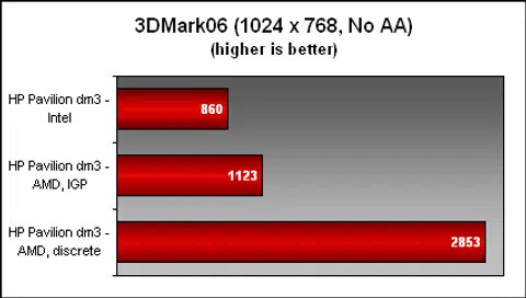 The results in this synthetic gaming benchmark is pretty much as expected with the AMD platform with the discrete graphics option taking the leader board position here. The difference between the IGP results of the AMD and Intel platforms however are pretty close - in fact it's close enough that we are inclined to say there might not be much real-world difference even for low-end 3D gaming. Having said that the 300-odd points difference doesn't seem significant, it still shows the weakness of the Intel IGP solution. So while the AMD based HP Pavilion dm3 machine is clearly the cheaper alternative, it also offers much better graphics performance. In this case with the unit's discrete graphics option, it allows you to get up to three times higher frame rates for a far smoother gaming experience or notching up the graphics quality options than if you only relied on an integrated graphics solution from Intel at a similar price point.