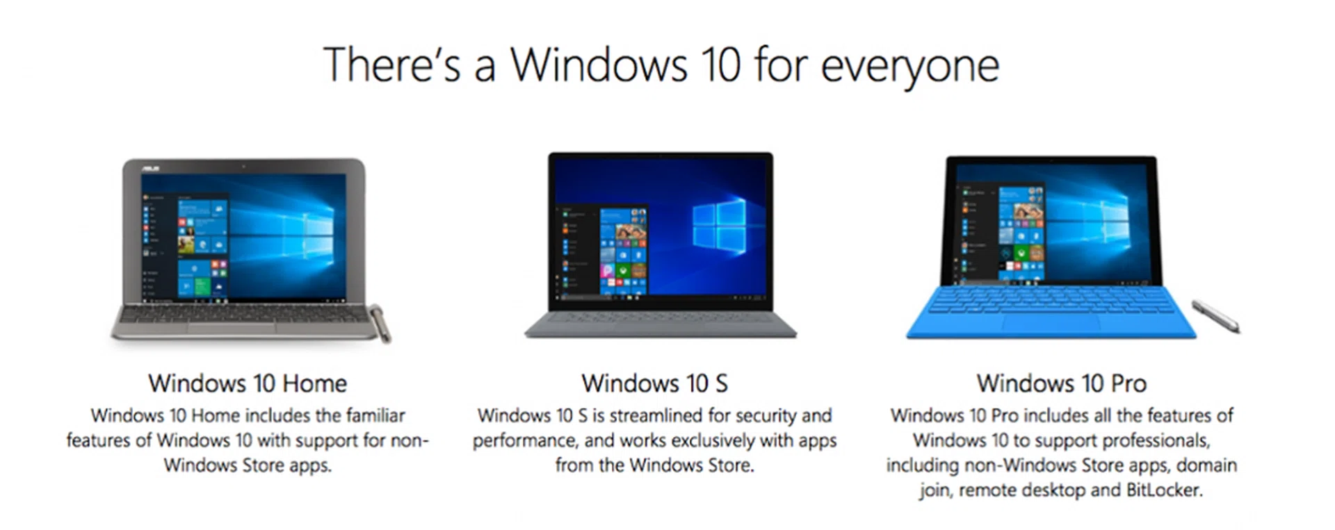 Windows 10 S, on the other hand, is a slightly stripped down version with some important restrictions. It isn’t as terrible as Windows RT (remember that?) but we think it is no less insidious. Windows 10 S was designed primarily for low-end devices in the education market. Windows 10 S has a faster setup and login process, but most importantly, only allows users to install apps from the Windows Store. This means you can use other browsers like Chrome, Firefox, or Opera. You also cannot use all the other apps that you might be accustomed to but isn’t available in the Windows Store like iTunes, Adobe Photoshop, Steam, and many more. We have a more detailed post about the two OSes here.