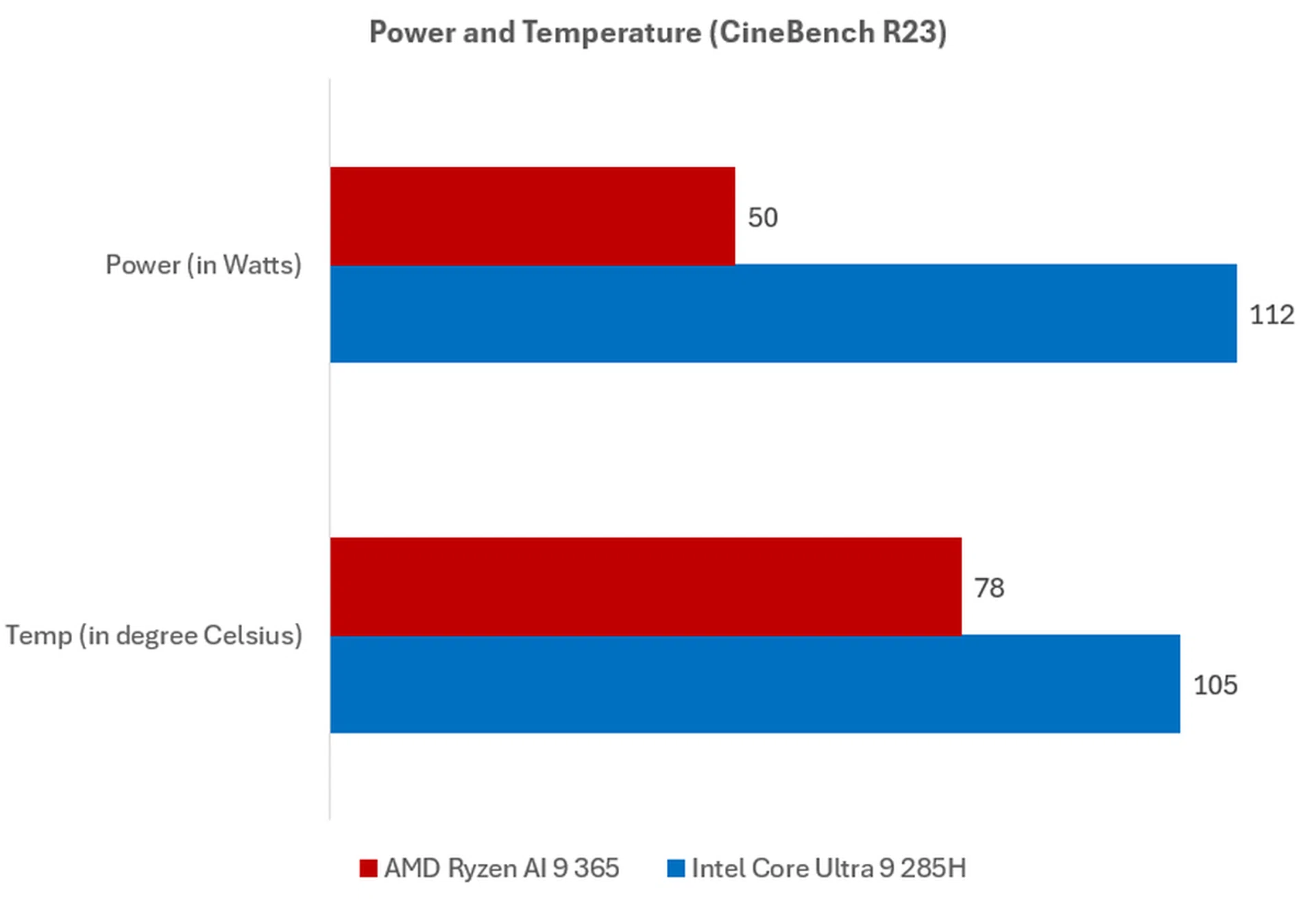 That power disparity isn’t limited to light usage. Under full CPU load in CineBench R23, Intel’s chip peaked at 112W and 105 degree Celsius, compared to AMD’s far leaner 50W draw and lower 78 degree Celsius. Clearly, the Intel-powered laptop consumed more power and generated more heat when pushed, but it also demonstrated that it can scale down effectively during light or mixed-use scenarios. AMD, meanwhile, appears more thermally conservative across the board, but pays for it with higher draw even during idle or low-load use. The end result? Intel delivers dramatically longer battery life, especially in real-world balanced workflows, though it comes at the cost of higher peak thermals and power spikes under load.