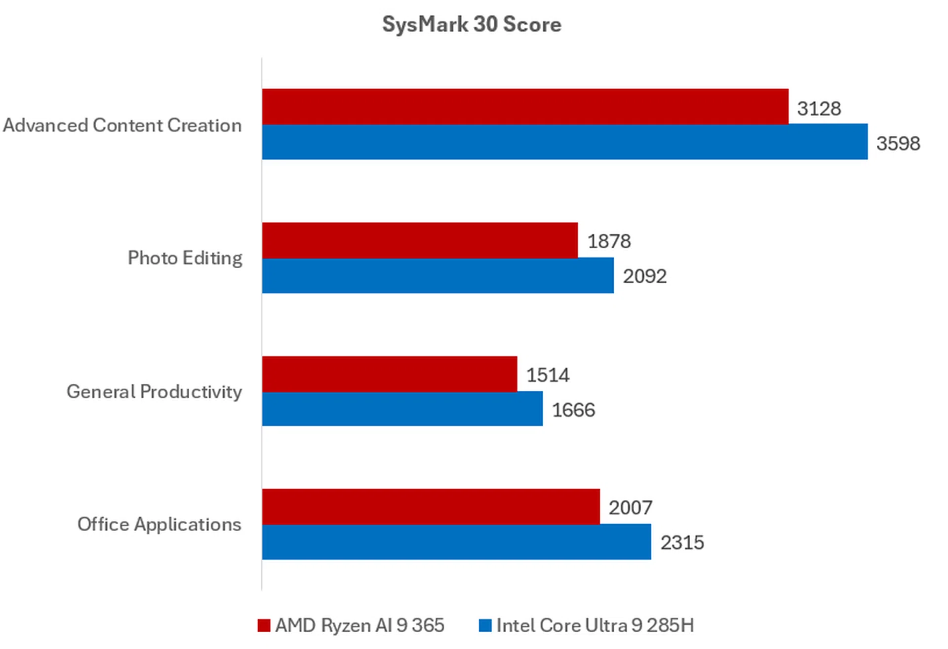 When it comes to general productivity and real-world performance, Intel’s Core Ultra 9 285H consistently posted higher scores across all categories in my favourite real-world benchmark, SysMark 30. It led in advanced content creation, photo editing, office applications, and general productivity, with margins ranging from moderate to substantial, and reflects Intel’s strength in workloads that lean on balanced CPU, GPU, and media engine coordination.