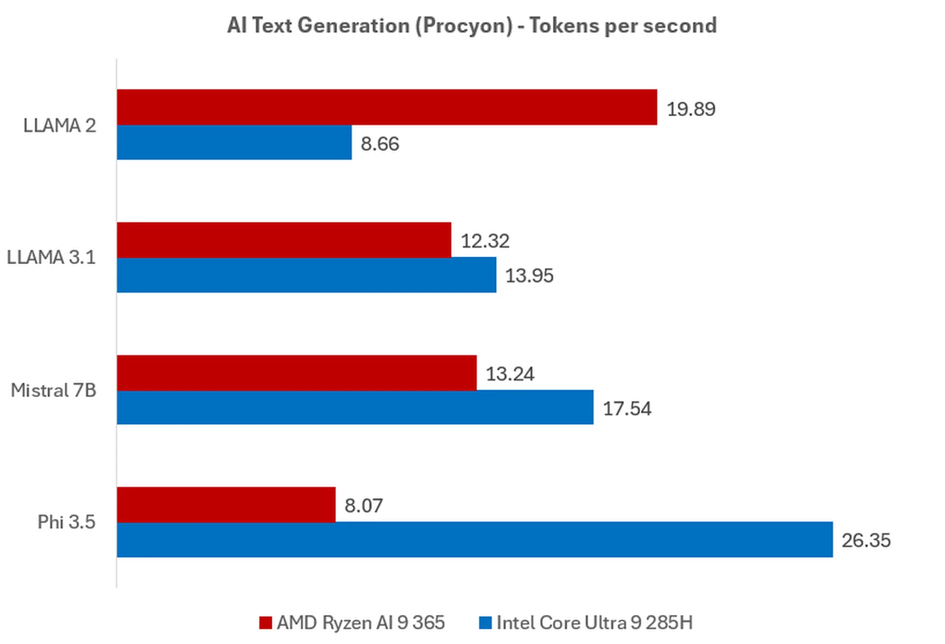 While both chips are branded as “AI-ready” and come with onboard NPUs, their real-world performance across AI workloads reveals clear differences in how those capabilities are implemented. In Procyon’s AI Text Generation test, the results were split – AMD’s Ryzen AI 9 365 was far ahead on LLAMA 2 (which is Meta's open-source large language model designed to tackle text and chat contextualisation), but Intel’s Core Ultra 9 285H clawed back wins on LLAMA 3.1, Mistral 7B (an LLM designed for coding and English language handling), and especially Phi 3.5 (an LLM by Microsoft to understand language and reasoning), where it delivered over three times the throughput of the competition.