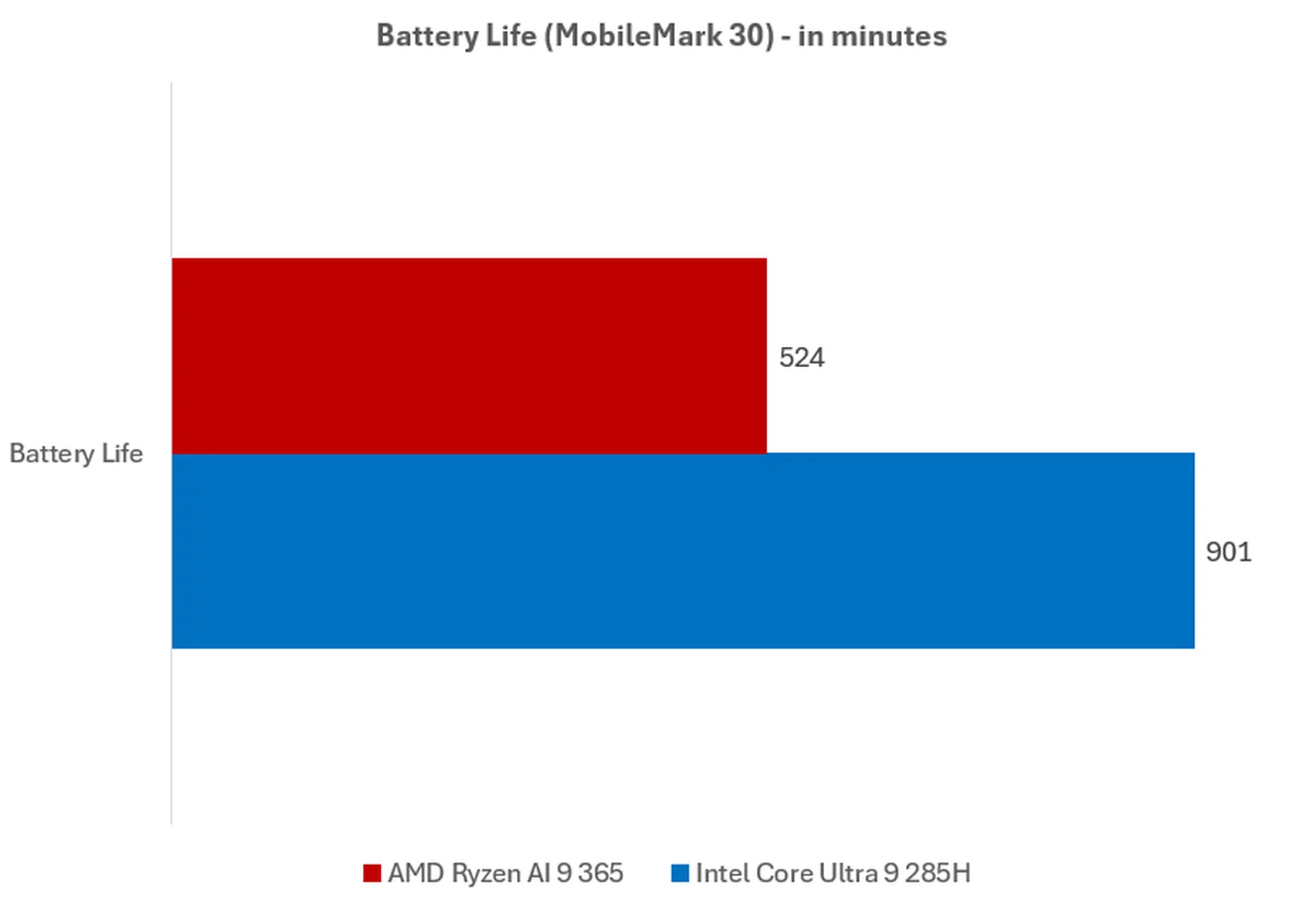 This is one area where Intel’s Core Ultra 9 285H pulls far ahead – by a margin that’s hard to ignore. In the MobileMark 30 test, the Intel-powered MSI Swift 16 AI Evo lasted 15 hours on a single charge, compared to just under 9 hours from its AMD-based counterpart. Granted that the Intel system has 20% more battery capacity, the resulting battery uptime difference is far more than the battery capacity discrepancy. To showcase this even more clearly, we decided to peer into power efficiency and here too, Intel has a significant lead: Intel drew just 6W on average during the test, whereas AMD pulled over 9W.