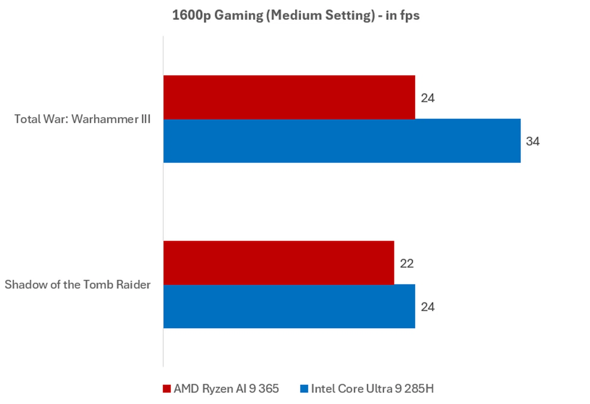 In gaming, the results were more mixed and heavily dependent on the title and resolution tested. Intel’s Core Ultra 9 285H led in Total War: Warhammer III across both 1080p and the default 1600p resolutions, posting a solid 62fps in the former resolution, compared to AMD’s 47fps. The gains here likely stem from stronger driver optimisation or better scaling under CPU-intensive RTS workloads. In contrast, Shadow of the Tomb Raider showed negligible differences between the two – both CPUs hovered around the 40fps mark at 1080p and dipped just slightly at 1600p. This suggests neither the Arc or Radeon 880M is particularly tuned for heavier AAA rendering at higher resolutions.