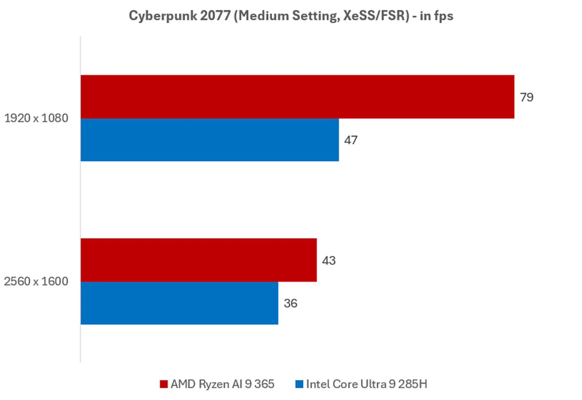 However, in Cyberpunk 2077, the AMD iGPU delivered a decisive blow thanks to its superior FSR upscaler over Intel's XeSS: 79fps at 1080p and 43fps at 1600p, against Intel’s 47fps and 36fps. That’s a significant win in one of the most demanding games on the test bench. So depending on what you play and at what resolution, either chip could have the edge; Intel clearly flexes harder when the GPU is pushed but AMD’s Radeon 880M has the upper hand in upscaling where FSR is supported – and there are quite a lot these days.
