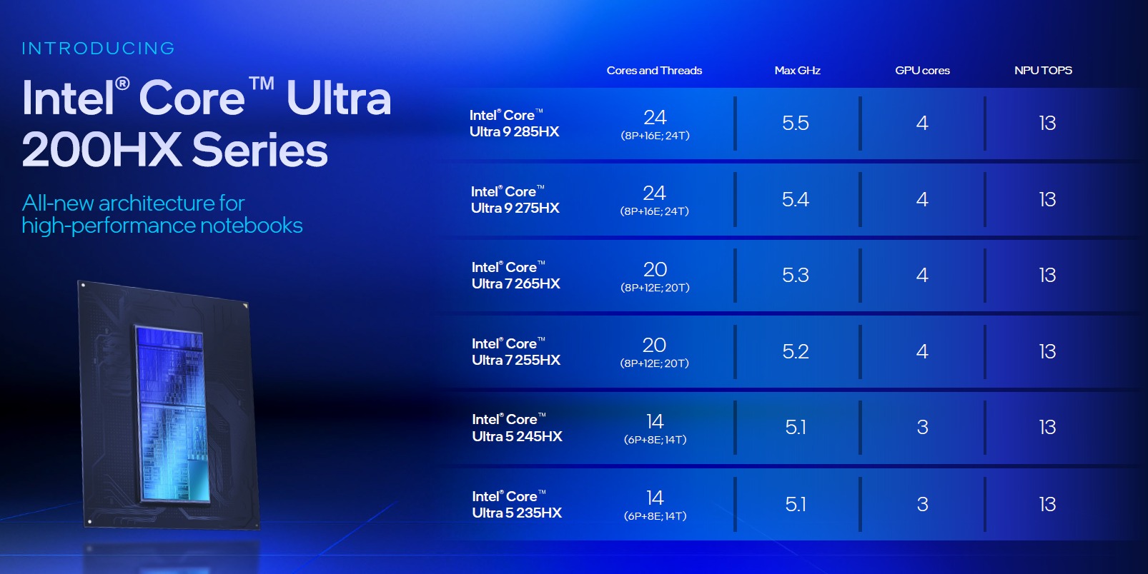 Intel Core Ultra 200HX Series – Aimed at mobile AI PC enthusiasts and gamers