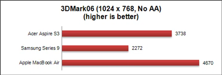 PCMark Vantage tests the overall performance of the machine, be it in terms of rendering web pages or photographs and other multimedia elements. In this test, the Acer Aspire S3's overall scores were quite abysmal when put beside the other two machines, but that was only because it didn't have an SSD. We briefly compared it to other classes of machines with similar specs, and its results were right on track for what components it had. The integrated graphics may not be very powerful, but will be good enough for non-professional work, like the occasional editing of photos. And finally, you have to remember that the Aspire S3 isn’t built to be an entertainment workhorse or a gaming machine; with that in mind, we’d say that the S3 did pretty well, and would recommend it as an all-purpose business or education machine.