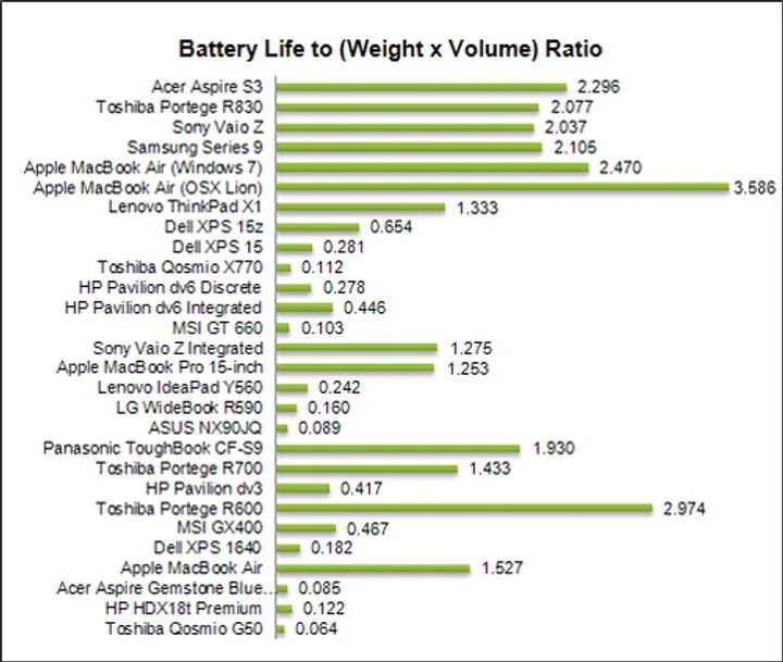 Our portability index scores are calculated using the machine’s weight, and battery life, and is a guide on whether or not it's worth your time to even bring the machine out. The MacBook Air scored tremendously well in this regard, especially when running on OS X. The Acer Aspire S3 is right on top with the best of them. With a score of 2.296, it's comfortably in the front of other competitors. However just like in power consumption, it lags quite a bit behind the MacBook Air.