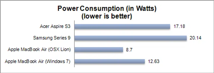 As for power consumption, the Aspire S3 is helped plenty by the lack of an optical drive, and an ultra-low-voltage processor - just like all other Ultrabooks. The only differentiating factors here are the model of processor used, as well as how well designed and effective are the machine's power management functions. As the charts suggest, the S3 actually does better than the Samsung Series 9 in terms of power consumption. However, when compared to the MacBook Air (in Windows 7), it trails behind. When the MacBook Air is running on OS X, no machine out there could come close (yet).