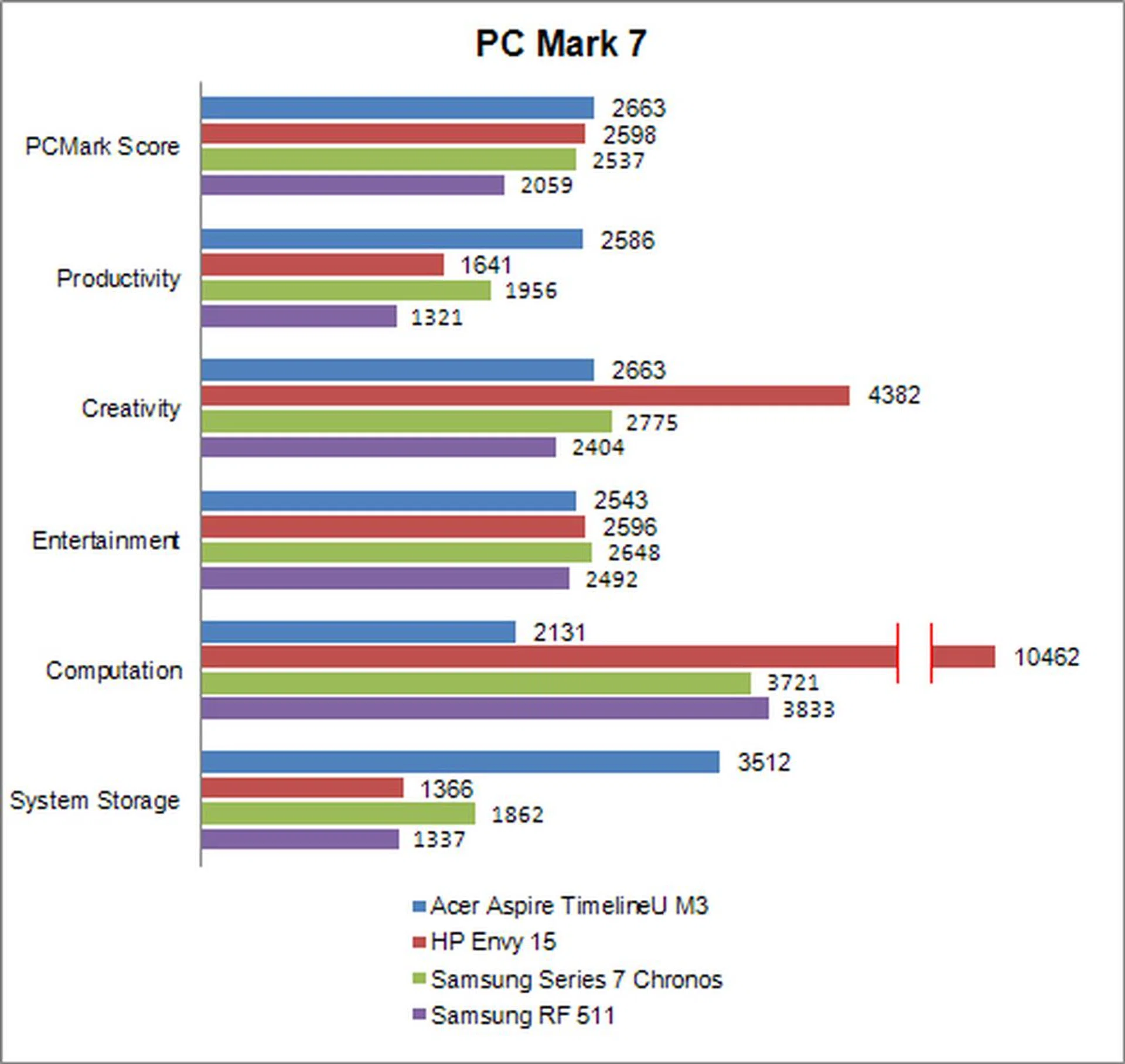 The PC Mark 7 benchmark program tests every aspect of a notebook's prowess, ranging from its gaming, rendering, encoding and even data retrieval capabilities (the benchmark takes about an hour to finish). This is particularly good for multimedia notebooks that need to be adequately capable in every aspect. As you can see from the chart below, the Acer Aspire Timeline Ultra M3 has the best scores, but just barely. The GeForce GT640M discrete graphics module definitely played a major part in keeping the notebook in front of its competitors, even if it is sporting a weaker processor as it made up for in some of graphics related sub-tests.