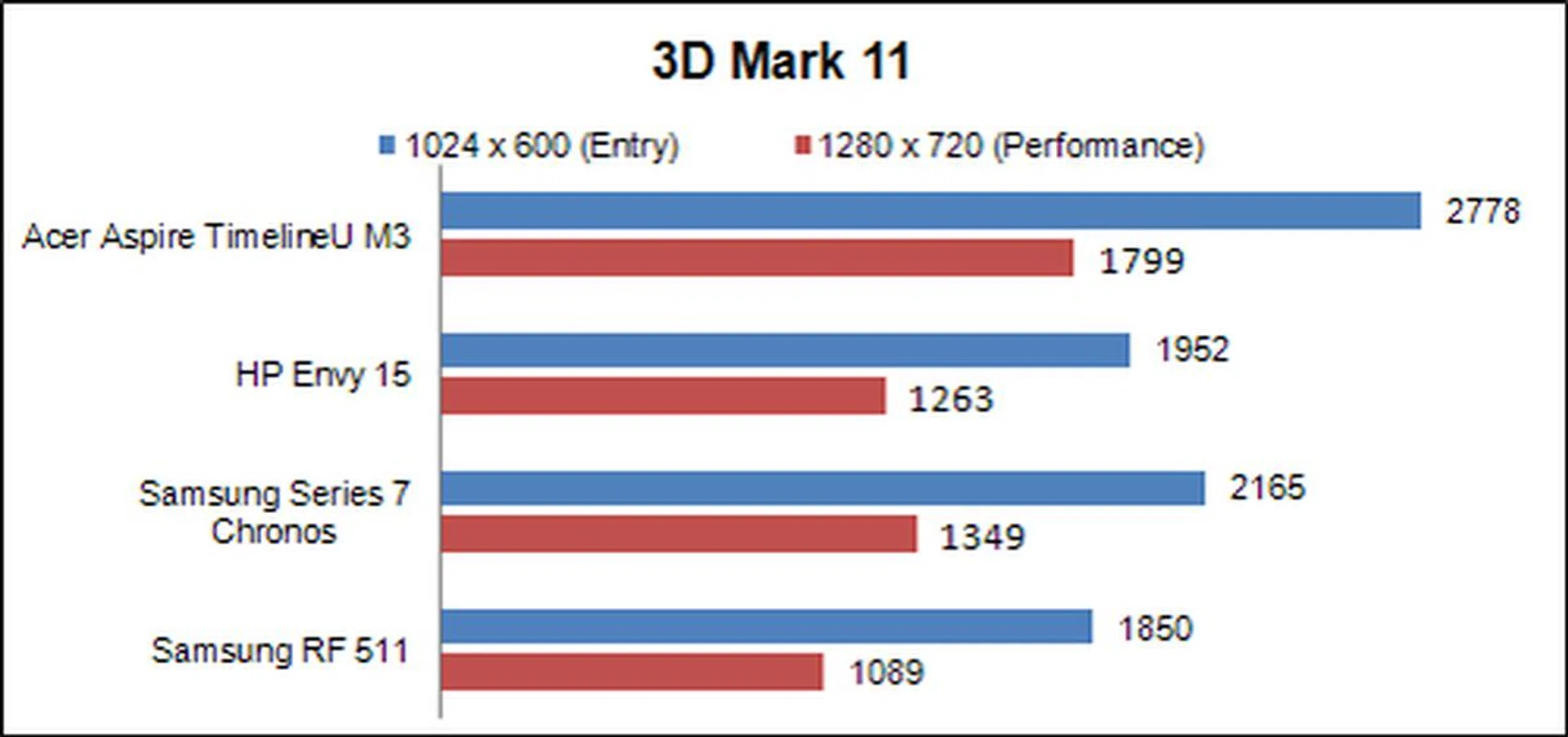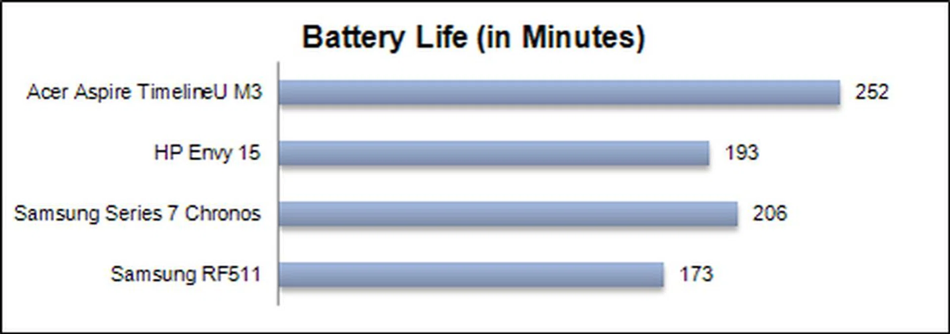 This is definitely better than the Dell XPS 15z, Toshiba Satellite P755, Samsung RF511 and HP Envy 15. The Samsung Series 7 Chronos comes in second place amongst the 15.6-inch class notebooks, but the Acer Timeline Ultra M3 tops them all easily as it had longer batter life, compact dimensions and lighter weight. Of course, you would also have to note that the Acer's processing platform is of a lower class that helped it shed off a lot of excess baggage compared to conventional multimedia notebooks.