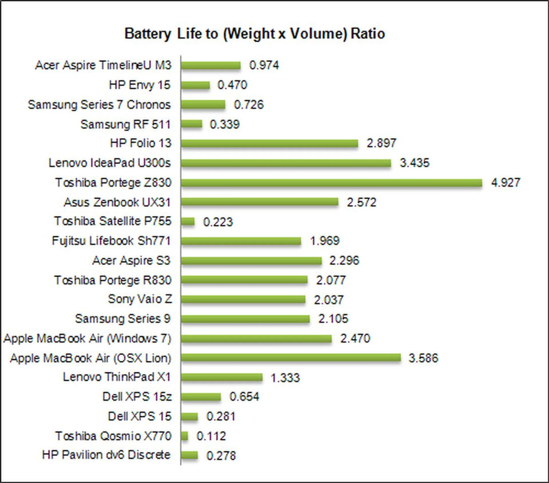 The HardwareZone portability index is basically the chart you’d want to pay attention to if you were looking for a notebook that won’t break your back when comparing within similar class of of notebooks. The resultant scores found in this chart indicate whether or not it’s worth your while to bring your notebook out, and the mathematical formula has elements like the machine’s weight, battery life and mass (or in other words, the volume it takes up in your bag).