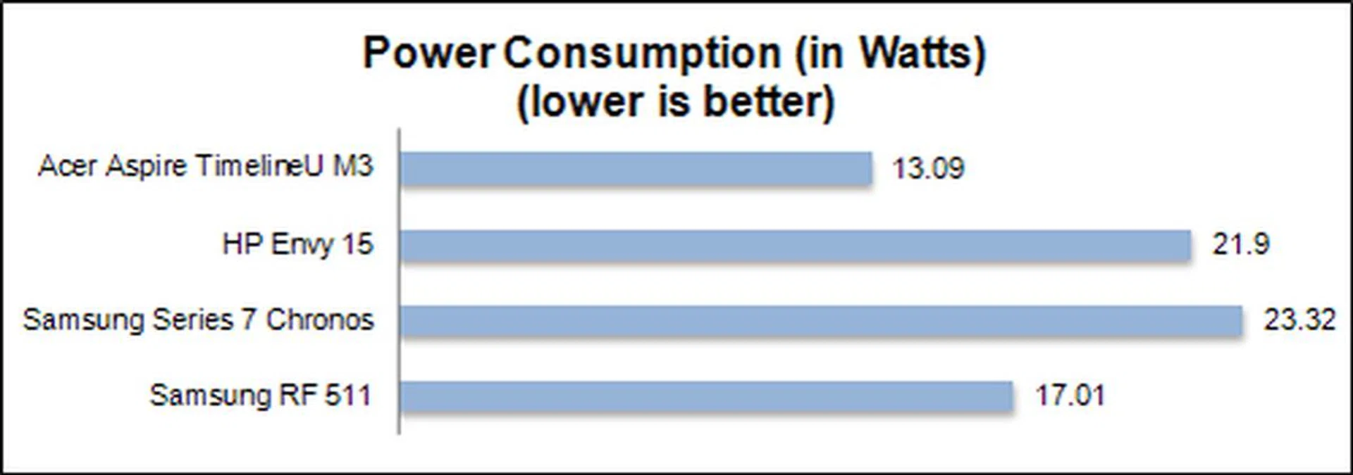 Again, the more efficient processing and graphics platform of the Acer machine boasted lower power consumption than the competition. While the results look great, you'll have to consider that the difference in hardware more than made up for these differences, including the lower resolution display (1366 x 768 pixels) that the M3 has.
