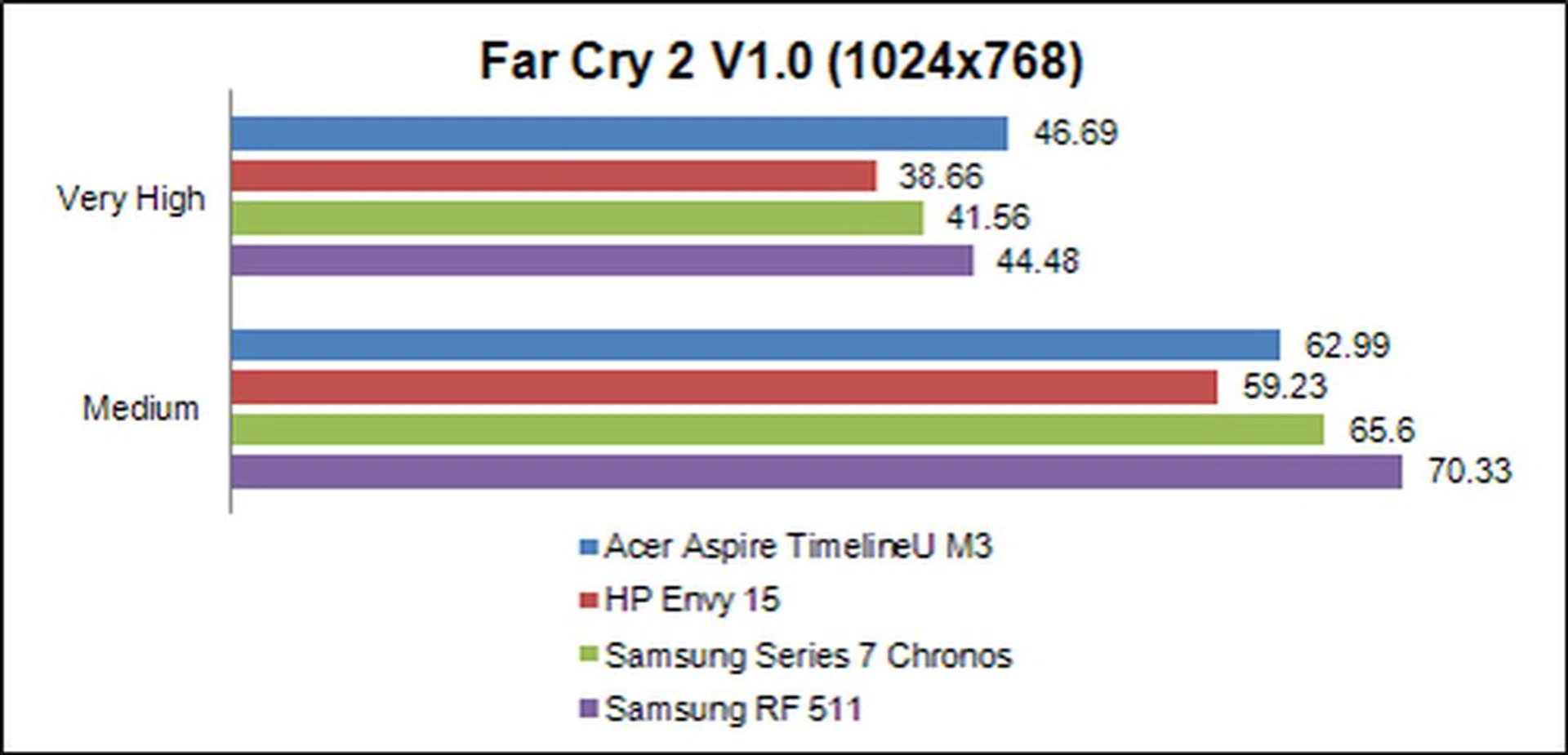The ideal benchmark of a notebook’s gaming capabilities would then of course be a real game. The Far Cry 2 benchmark puts the Acer Aspire Timeline Ultra M3 in a scenario that taxes the notebook's graphics unit and the rest of the system . From the results below, you can tell that the Acer Aspire Timeline Ultra M3 is capable of running some of the more intensive games and given its low native screen resolution, the system shouldn't have any issues. Though you probably can't see much of a speed advantage of the new GPU, that's only because the Acer system is up against other more powerful processing platforms that levels up the differences in compute and graphics crunching platforms. We have to make do with these differences since it's not easy to get identically configured platforms for notebooks.