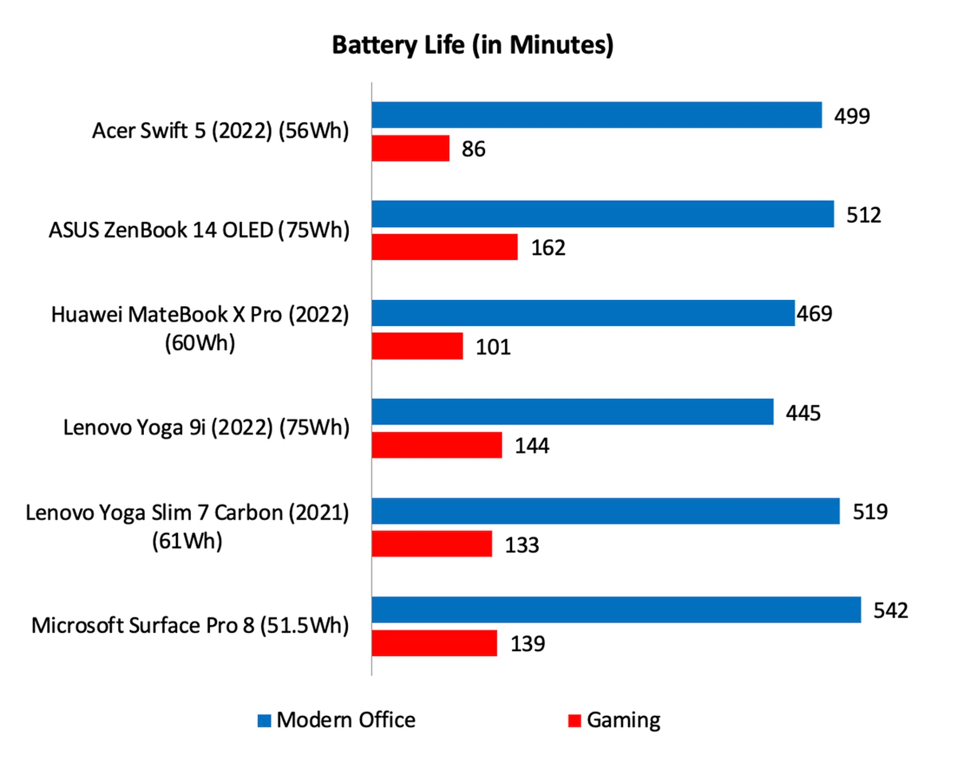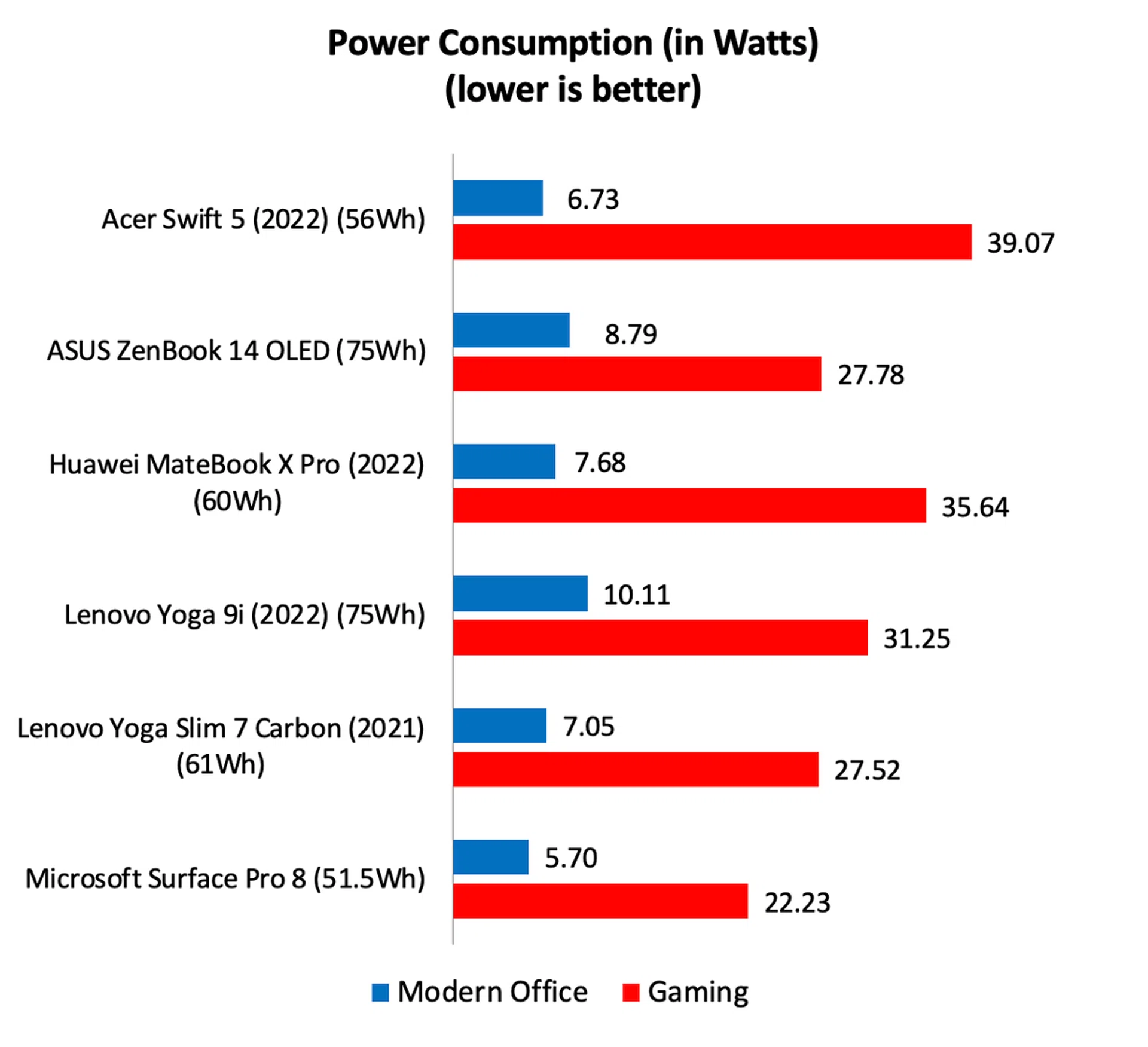 Battery life was quite good too because despite having a smaller 56Wh battery, it lasted almost just as long as the ASUS ZenBook 14 OLED and Lenovo Yoga Slim 7 Carbon which have larger 75Wh and 61Wh batteries respectively. Its power consumption, particularly on the Modern Office workload, was impressively low, which explains how it managed to last this long despite the small battery. Battery life on the more intensive gaming workload, however, was poor. Again, this can be explained by its power consumption figure, which was the highest.
