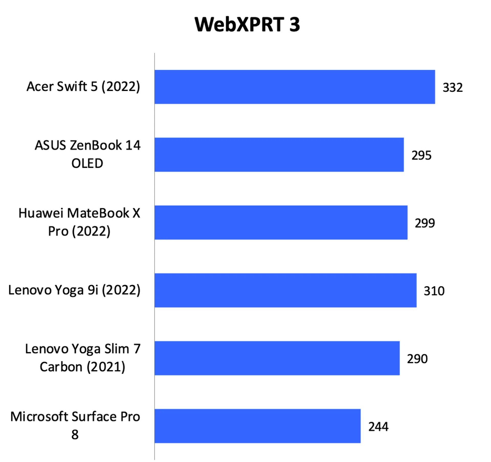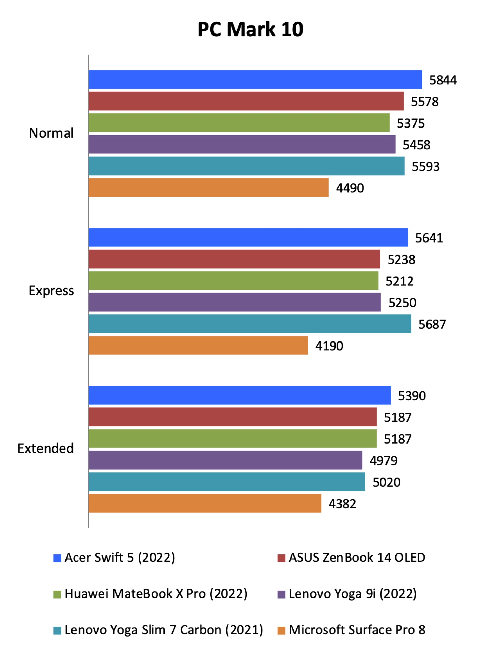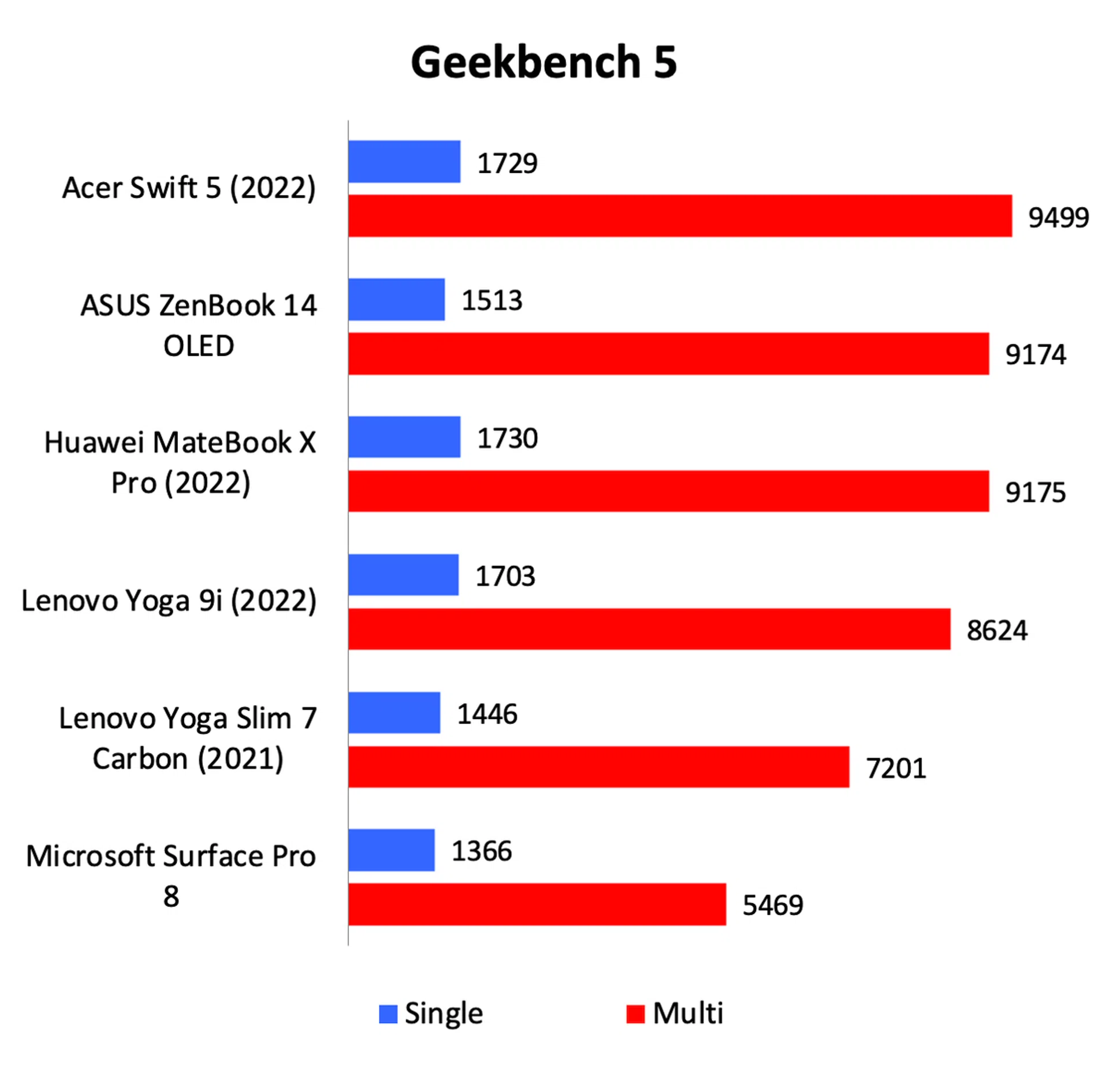 The Swift 5’s CPU performance was good, particularly in multi-core workloads. It recorded the highest numbers we’ve yet seen for a Core i7-1260P processor on both Cinebench’s and Geekbench’s multi-core workload – outperforming even the Lenovo Yoga Slim 7 Carbon which is powered by a Ryzen 7 5800U processor. Its scores on PCMark 10 and WebXPRT were class-leading too. Graphics performance was very decent even if it wasn’t quite as impressive as its CPU numbers. It was just as fast as Lenovo’s Yoga 9i.
