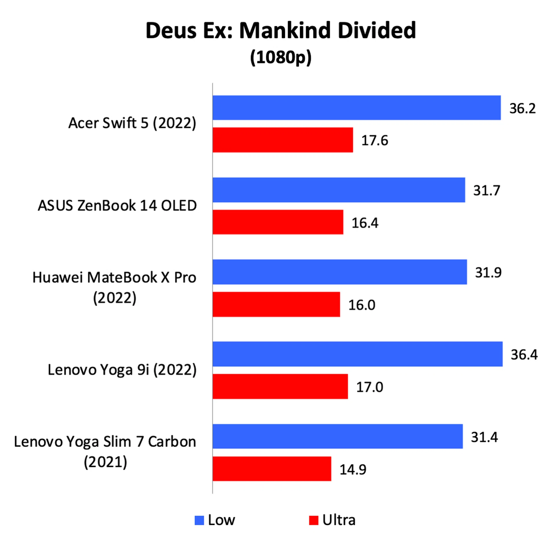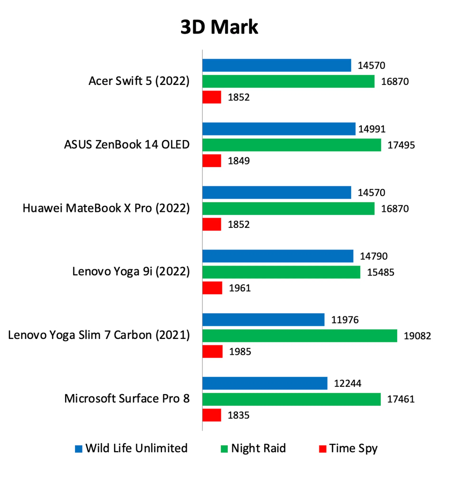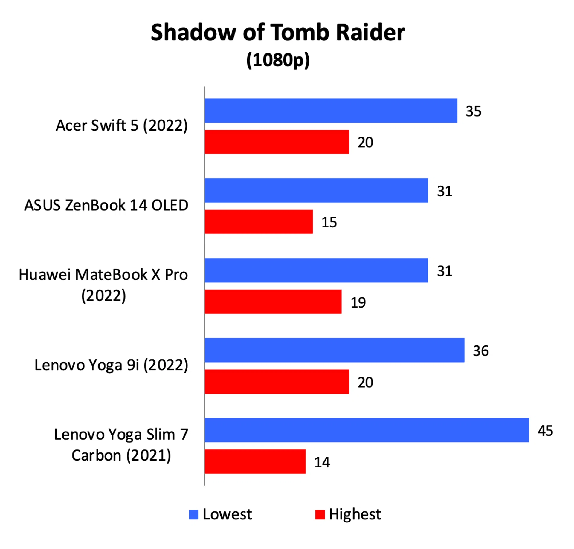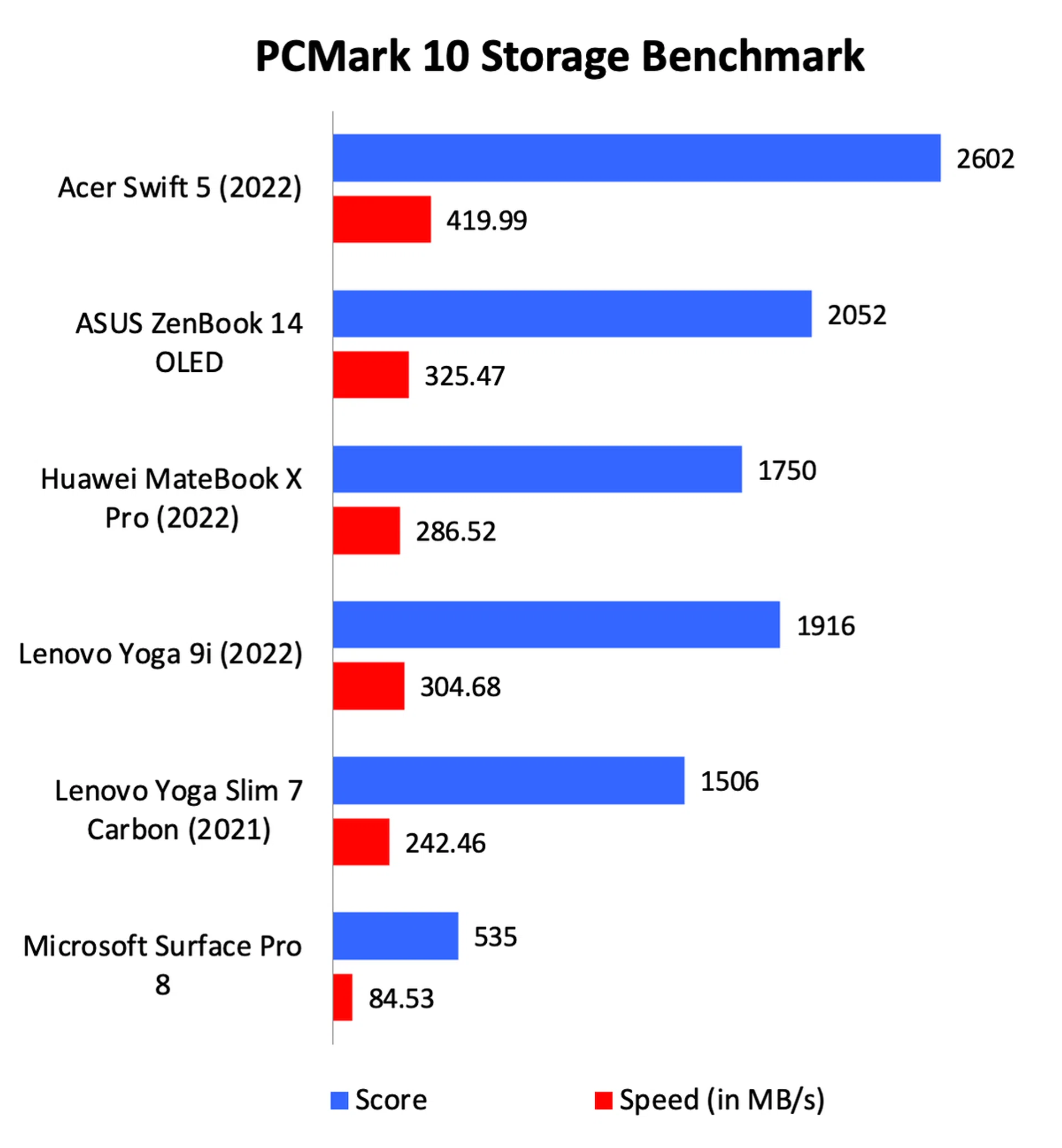 The Swift 5’s CPU performance was good, particularly in multi-core workloads. It recorded the highest numbers we’ve yet seen for a Core i7-1260P processor on both Cinebench’s and Geekbench’s multi-core workload – outperforming even the Lenovo Yoga Slim 7 Carbon which is powered by a Ryzen 7 5800U processor. Its scores on PCMark 10 and WebXPRT were class-leading too. Graphics performance was very decent even if it wasn’t quite as impressive as its CPU numbers. It was just as fast as Lenovo’s Yoga 9i.