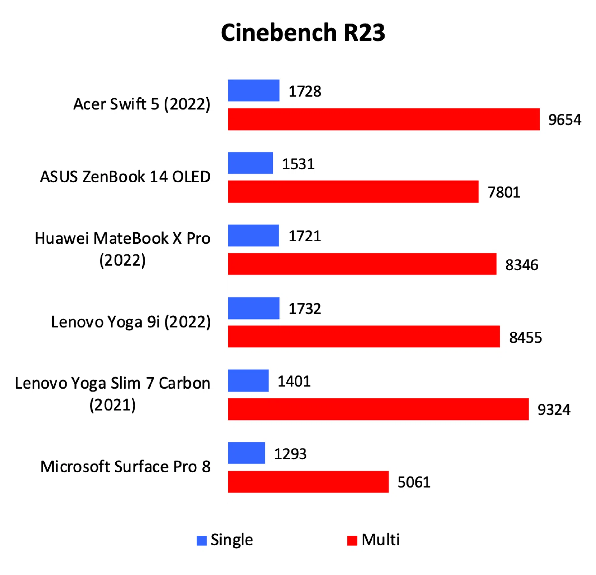 To recap, the version of the Swift 5 I’m testing has a Core i7-1260P processor with 16GB of LPDDR5 memory and a 1TB PCIe 4.0 SSD. Here’s how it stacks up against other ultraportable notebooks that I tested recently.