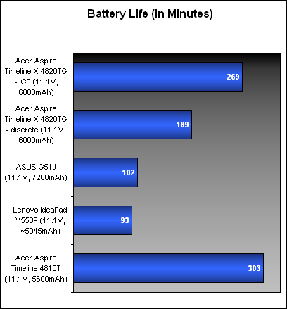 We have now re-tested the battery testing portion for the Acer Aspire Timeline X 4820TG with integrated graphics in addition to our earlier reporting that was based on just testing with discrete graphics and have edited the article with our new observations and comments.