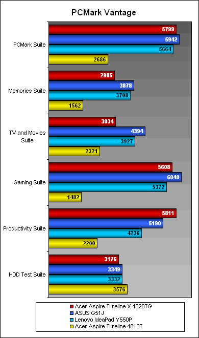Like the previous benchmark, the scores here do indicate that the Acer notebook still has the lead over the Lenovo unit, but the ASUS gaming rig with its better GPU gives the 15.6-inch unit a slight lead over the Acer Timeline X 4820TG. We'll see how much more the GPU plays a part in the next benchmark section, but it seems pretty clear that it's a pretty important factor for overall notebook performance.