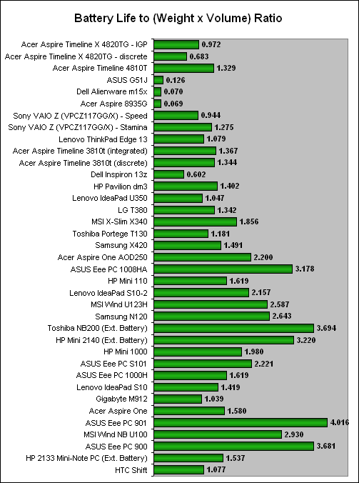 Our Portability Index is a simple comparative measure to find out how portable a notebook is based on physical attributed and battery uptime; it's most useful to compare products within a same category to know which offers the best portability in its segment. Calculation of the ratio is simply the battery uptime of a notebook divided by the product of a notebook's weight and volume, and while it does sound a wee bit complicated, it's quite easy to grasp: the higher the ratio, the more portable the unit is.