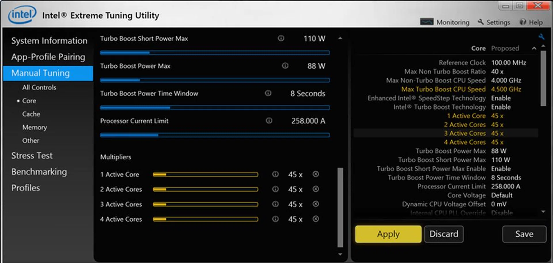 We used the Intel Extreme Tuning Utility to overclock the Aftershock W-15. We tried multiple variations, increasing the core multipliers slowly and then stress testing the machine to make sure the W-15 holds up to the strain. In the end, the above setting (multipliers all set to 45x) was the best we could do without risking instability as anything above that crashed the machine every time we tried to stress test it. Note that on 45x multiplier, the Max Turbo Boost CPU Speed is now 4.5GHz, a 100MHz (2.27% improvement) increase from the default 4.4GHz.