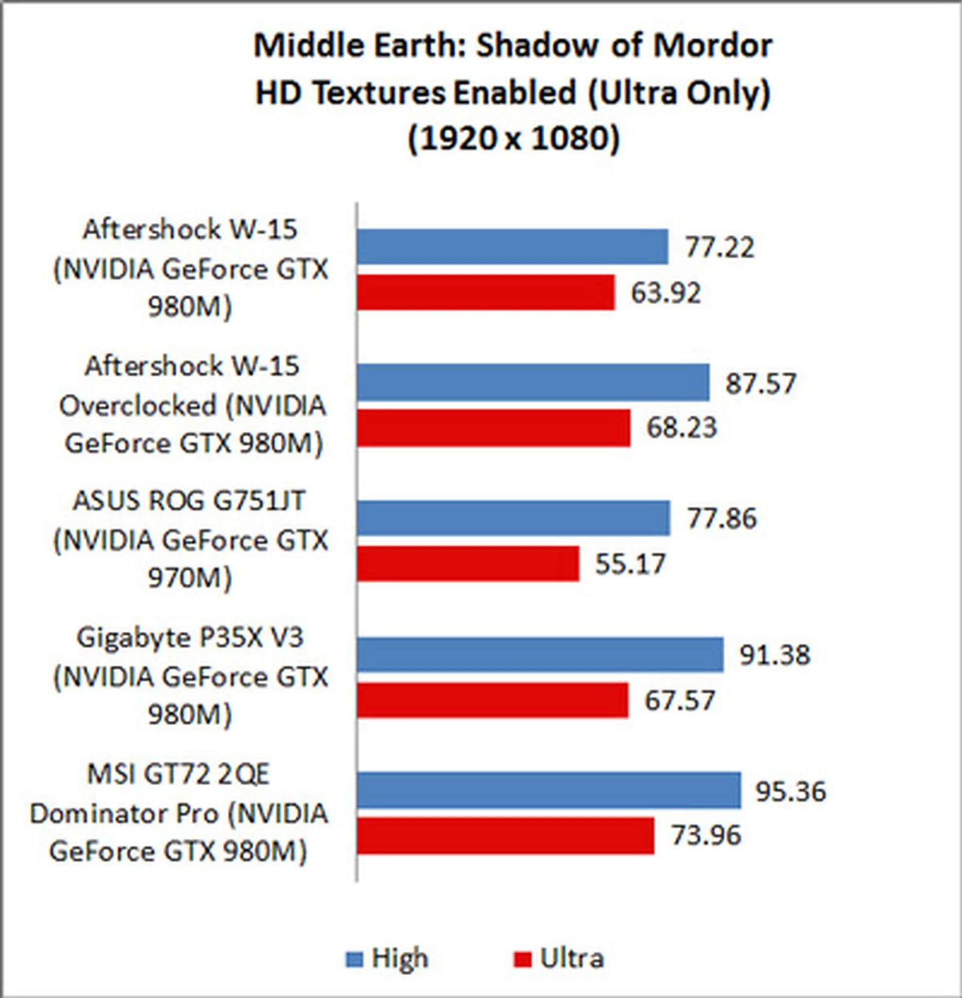 Despite the Aftershock W-15 using a desktop processor, none of our benchmarking procedures have changed. We're still using PC Mark 8 for general benchmarks, 3D Mark 2013 to gauge 3D performance, Tomb Raider to measure gaming performance on a older game and Middle Earth: Shadow of Mordor to see how the machine performs on new games.