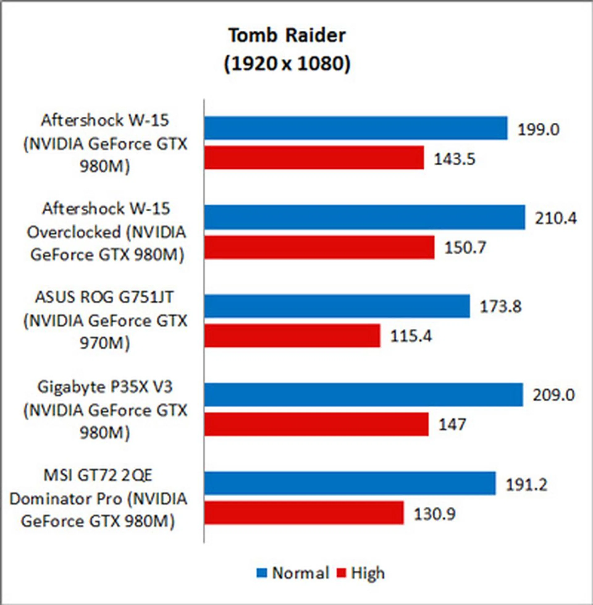 Aftershock W-15's performance on this game is somewhat disappointing and quite unlike the results garnered in earlier tests. In fact, it managed no better than the ASUS ROG notebook on the High quality setting, which is somewhat troubling when you consider that this notebook has a lower class GeForce GTX 970M GPU. Even when overclocked, its results don't quite match up to the Gigabyte P35X V3 and MSI GT72 2QE Dominator Pro.