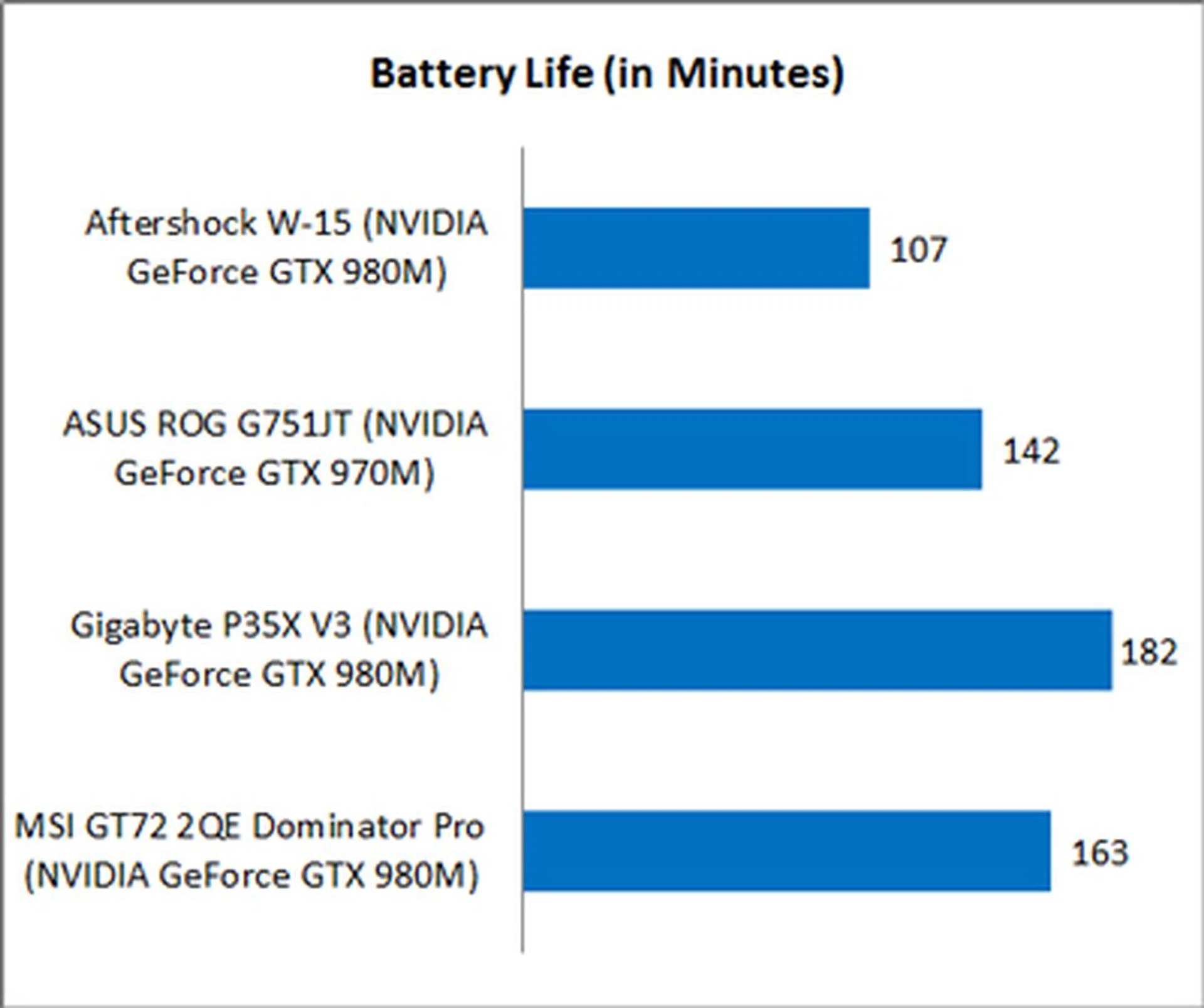 There's really nothing surprising here. The desktop processor in the Aftershock W-15 is a massive energy hog, a fact we mentioned earlier in the review. That very reason is why we aren't surprised at all that the machine doesn't even last two hours, despite having a 82Wh battery. In comparison, the ASUS machine had a 88Wh battery, the Gigabyte notebook had a 75.81Wh battery and the MSI GT72 2QE Dominator Pro had a 83Wh battery.