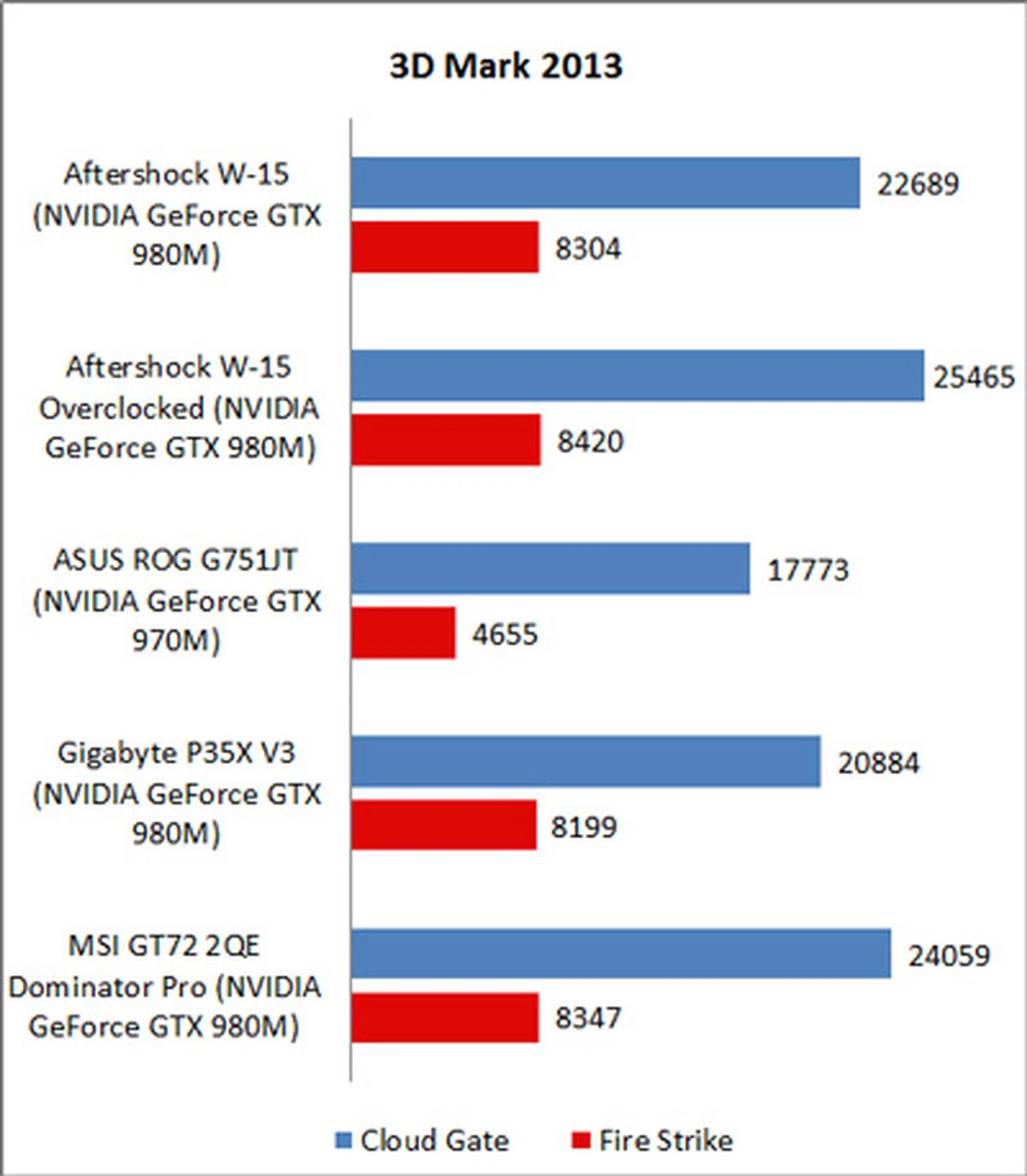 Overclocked, the Aftershock W-15 performs even better, not only surpassing its initial benchmarks but also that of the MSI GT72 2QE Dominator Pro. On Cloud Gate, the Aftershock W-15 saw an increase of 12.24% over its initial benchmark. On Fire Strike, the increase wasn't as substantial at 1.4% but it was still enough to give it the highest score out of all the machines compared.